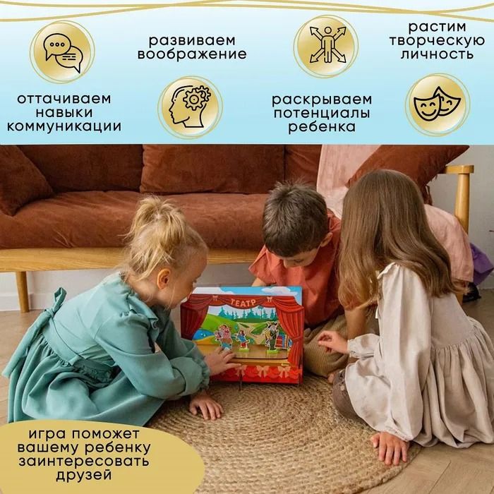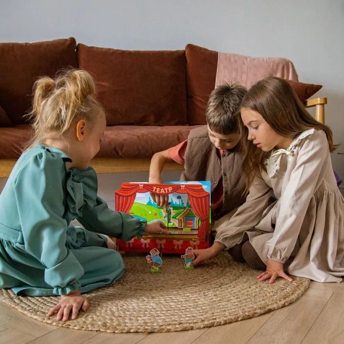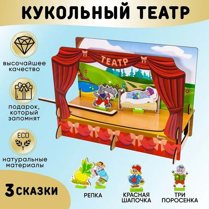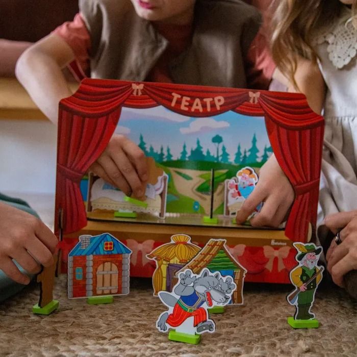 В комплекте к театру приложена инструкция для сборки, а простые и знакомые всем нам сказки помогут разыграть представление максимально ярко и весело!