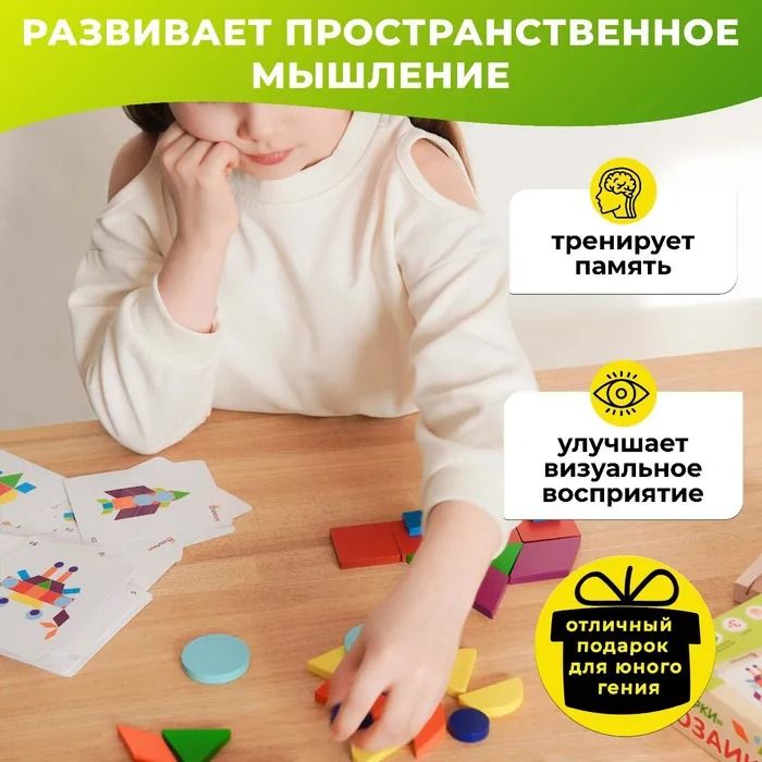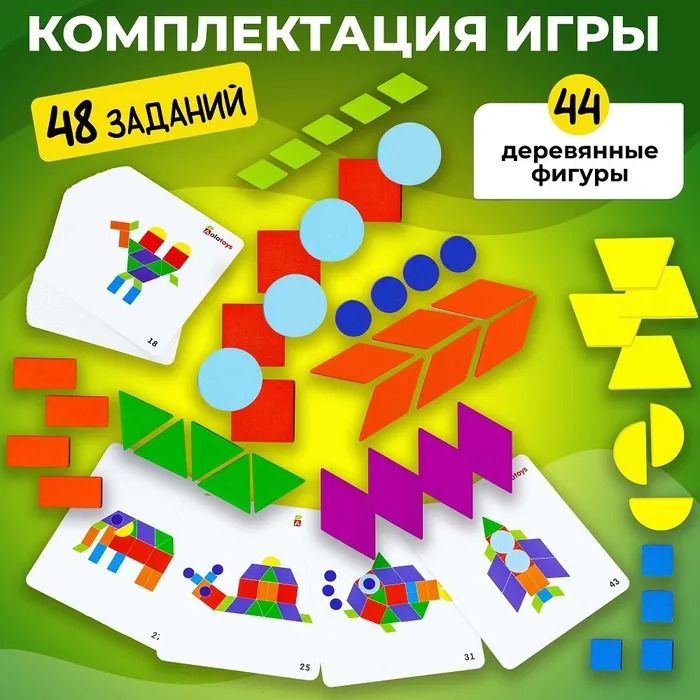 В комплекте с фигурами есть 48 заданий на карточках, которые помогут составить животных, птиц, здания и многое другое!