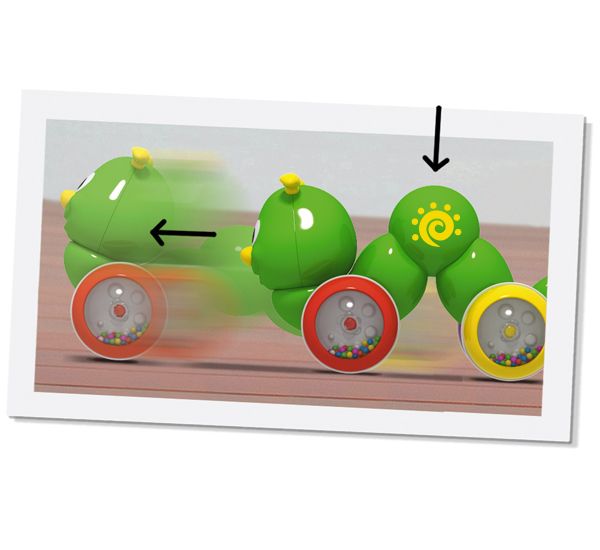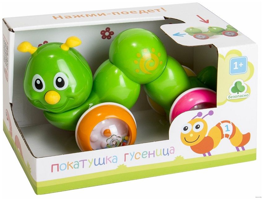 Игрушка-покатушка «Гусеница»  несомненно понравится каждому малышу. Ребенок  будет с  большим удовольствием играть с нашей игрушкой-покатушкой, которая выполнена в виде симпатичной гусенички в приятных ярких цветах. Для того чтобы гусеничка покатилась вперед, её необходимо поставить на ровную поверхность и нажать сверху. Запуская гусеничку, ребёнок увидит логическую связь между приложенным усилием и результатом своих действий. А догоняя покатушку, малыш приобретет ловкость и уверенность в своих движениях. Голова гусенички крутится в разные стороны с забавным потрескиванием, мягкие ушки гусенички гнутся, а при нажатии на нос-кнопку можно услышать негромкий приветственный писк. Также во время игры деткам обязательно понравится наблюдать за тем, как пересыпаются разноцветные шарики в колесах при движении шустрой гусенички. Мы уверены, что покатушка «Гусеничка» станет любимой игрушкой малыша на долгое время.   Подходит детям от 1 года. Развивает координацию движений и игровые навыки. Стимулирует двигательную активность и побуждает к познавательной деятельности.