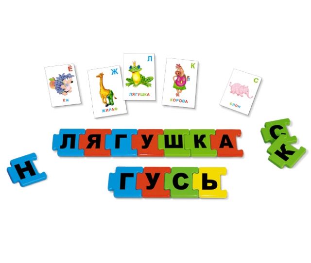 Игра «Стану отличником «Азбука» понравится и детям, и мамам. В ней малышам предстоит именно играть с буквами, а не учить их. Еще интересней игру делает элемент сюрприза. Ребенку необходимо вытягивать перевернутые карточки с забавными изображениями, каждое из которых подписано, а затем выкладывать такое же слово из фишек на столе. Фишки легко крепятся друг с другом и окрашены в соответствии с основами фонетики: гласные – обозначены красным цветом, согласные - синим (звонкие) и зеленым (глухие). Пусть малыш их найдет по цвету самостоятельно, постарайтесь в произношении звука в словах доказать правильность его выбора. Для детей от 3 лет. Знакомит с буквами и звуками русского языка, развивает речь и мелкую моторику, способствует развитию навыков чтения и письма.