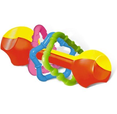 Игрушку в форме гантельки малышу не под силу взять в рот, поэтому она идеальна для его игр. Как бы ребенок не повернул погремушку, она будет всегда ему интересна. Оба конца гантельки снабжены наполнителем из мелких шуршащих шариков, за которыми ребенок может наблюдать. Старших малышей увлекут разъемные элементы на рукоятке погремушки. Для детей от 0 мес. Развивает остроту зрения и слуха, цветовосприятие, тактильную чувствительность, мелкую моторику. Формирует зрительно-моторную и зрительно-слуховую координацию.
