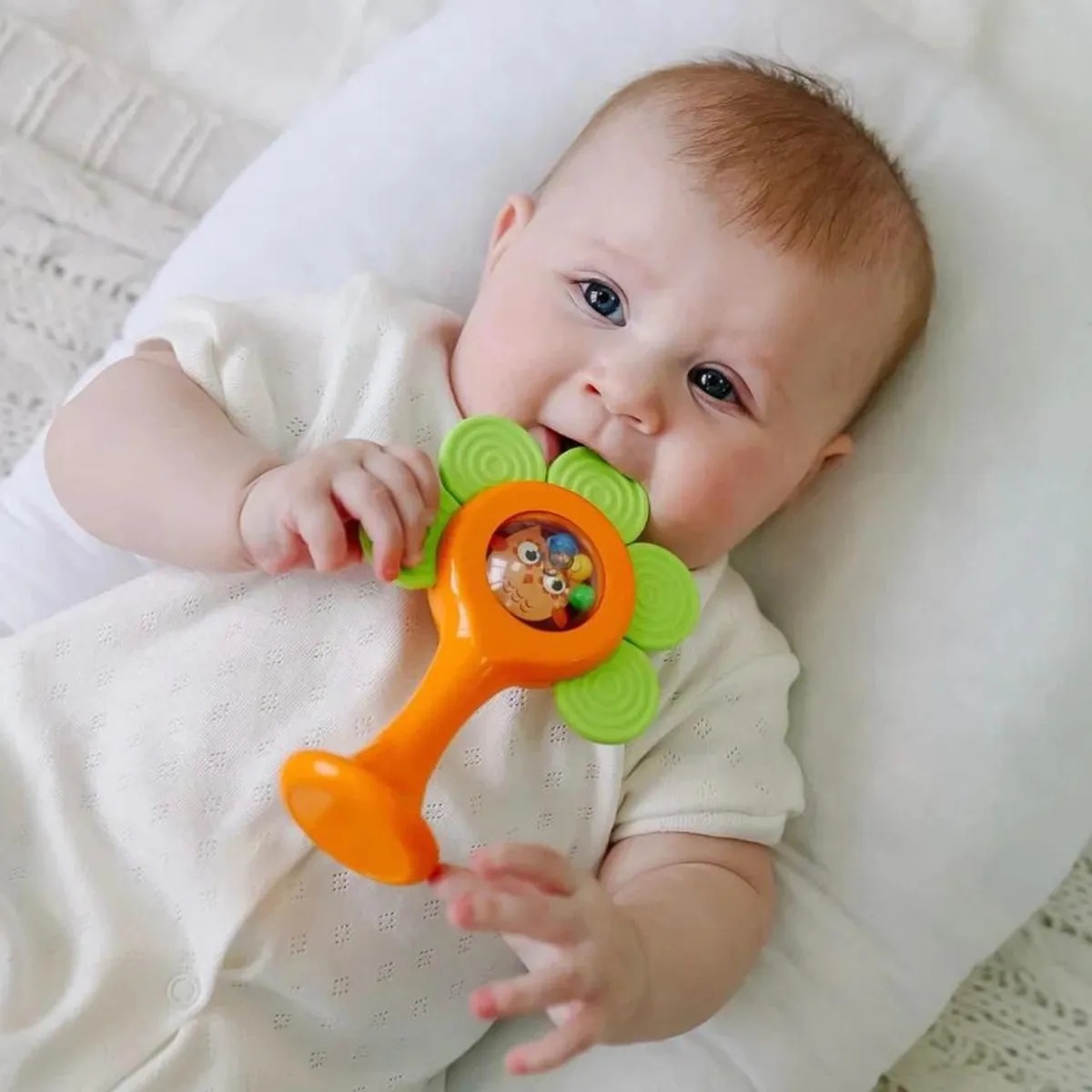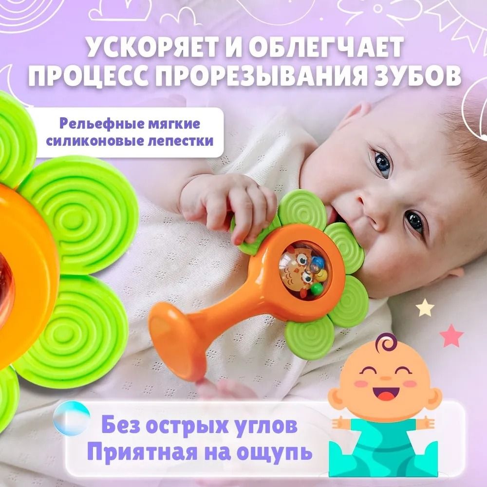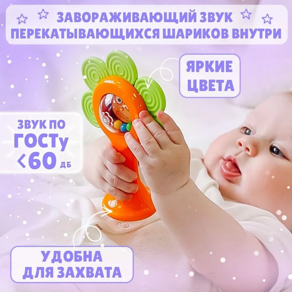Веселая погремушка так и просится, чтобы ее взяли в ручки, благодаря удобной для захвата форме, специально разработанной для самых маленьких. Игрушку можно поставить на стол, малышу будет интересно самостоятельно брать ее, исследовать, трогать пальчиками и крутить в руках.