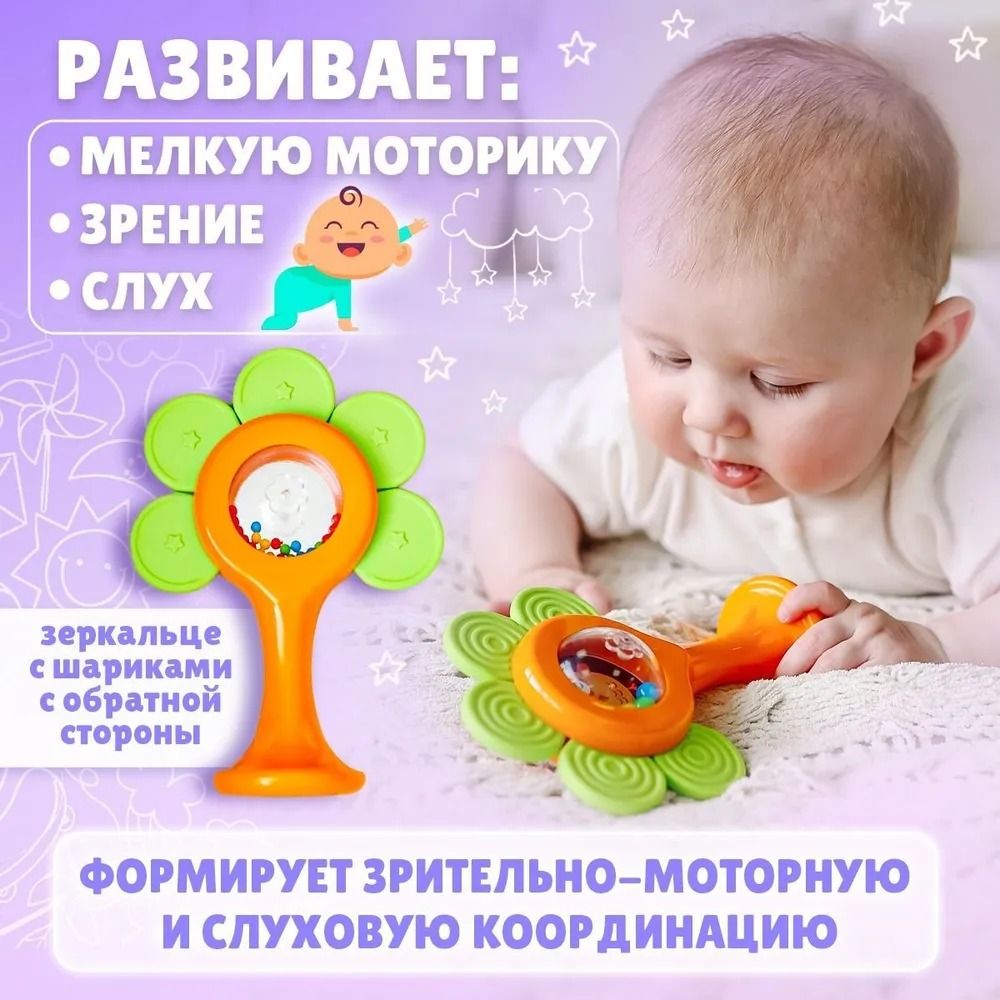 С одной стороны погремушки находится яркая привлекательная картинка и разноцветные шарики, издающие приятный звук при потряхивании. С обратной стороны игрушки, по центру, расположено небольшое зеркальце, отражение в котором надолго увлечет малыша и точно не даст ему заскучать.