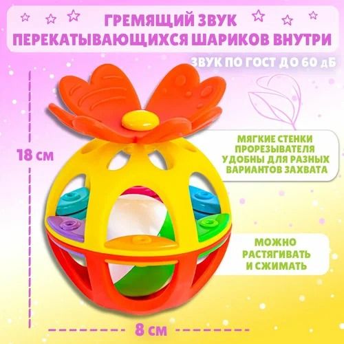 Все части игрушки выполнены из эластичного безопасного материала, благодаря чему она легко сжимается, растягивается и вновь принимает исходную форму. Внутри круглой основы расположен шарик, при потряхивании он издаëт приятные звуки, которые так нравятся детям и вызывают еще больший интерес к игрушке. Лепестки "Тюльпанчика" можно кусать, таким образом массируя дëсны и снимая неприятные ощущения. Погремушку-прорезыватель "Тюльпан" очень удобно удерживать маленькими ручками. Игрушка легко моется и абсолютно безопасна для крох.