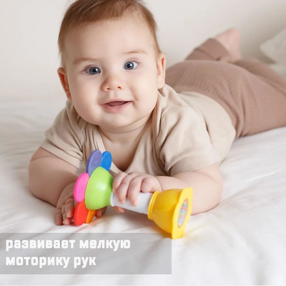 Наша Погремушка «Ромашка» создана с заботой о вашем малыше. Лепестки ромашки сделаны из безопасного мягкого материала и служат в качестве прорезывателя. Погремушка имеет множество интересных функций, способных увлечь вашего малыша на продолжительное время (двухцветный шарик крутится, разноцветные шарики за прозрачным окошком пересыпаются, основание «Ромашки» можно вращать, а если потрясти вверх-вниз погремушку, то она издаст необычные звуки). А еще малыша обязательно заинтересует блестящее зеркальце на дне погремушки «Ромашки». Во время игры с «Ромашкой» малыш будет каждый раз обнаруживать что-то новое и удивляться своему открытию. Для детей от 0 мес. Развивает концентрацию зрения и слуха, цветовосприятие, тактильную чувствительность, мелкую моторику. Формирует зрительно-моторную и зрительно-слуховую координацию.