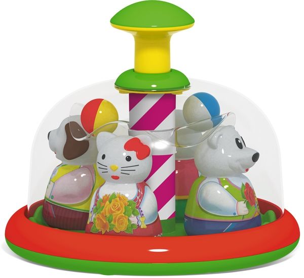 Юла-карусель «Аттракцион» - это развивающая игрушка для самых маленьких. Она напоминает детский аттракцион в парке с катающимися на нем зверушками. Малыш сам сможет запускать юлу-карусель и влиять на скорость вращения карусели, нажимая на большую кнопку сверху. После запуска зверушки в ярких костюмах начинают вращаться, привлекая внимание малыша. Под куполом юлы на прозрачной площадке находятся разноцветные шарики, которые при движении выкатываются к стенке купола, а при остановке возвращаются на свои места. Цветовое решение игрушки полностью отвечает особенностям младенческого восприятия, поэтому яркая и цветная юла будет всегда приятна и притягательна для малыша. Мы уверены, что завораживающее вращение юлы и бодрящее звучание при движении подарит бурный восторг и замечательное настроение вашему ребенку. Конструкция ЮК «Аттракцион» запатентована.