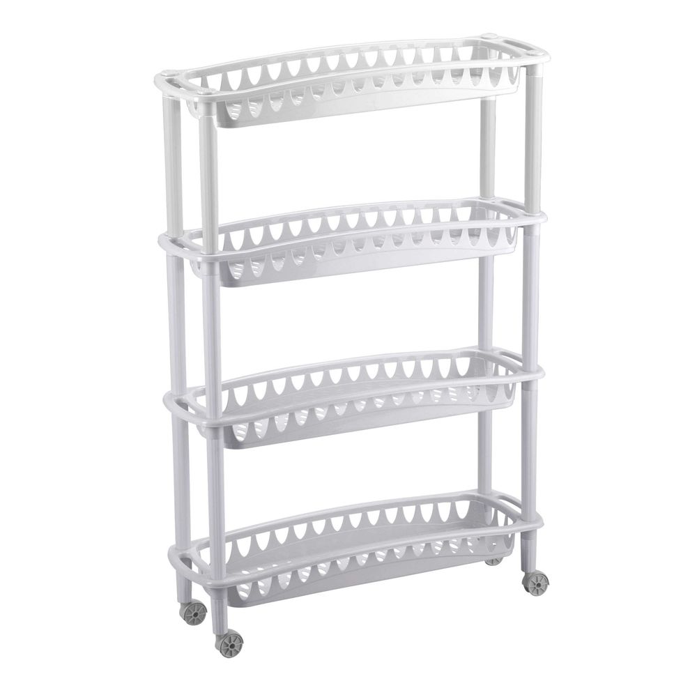 Узкая этажерка «Джулия» имеет форму и размер, которые позволяют рационально использовать пространство ванной комнаты, кухни и других помещений. Отлично подходит для хранения повседневных мелочей, средств гигиены и бытовой химии, газет и журналов, овощей и фруктов, игрушек и предметов для детского творчества. Имеются колесики, которые обеспечивают комфортное перемещение этажерки. Бытпласт