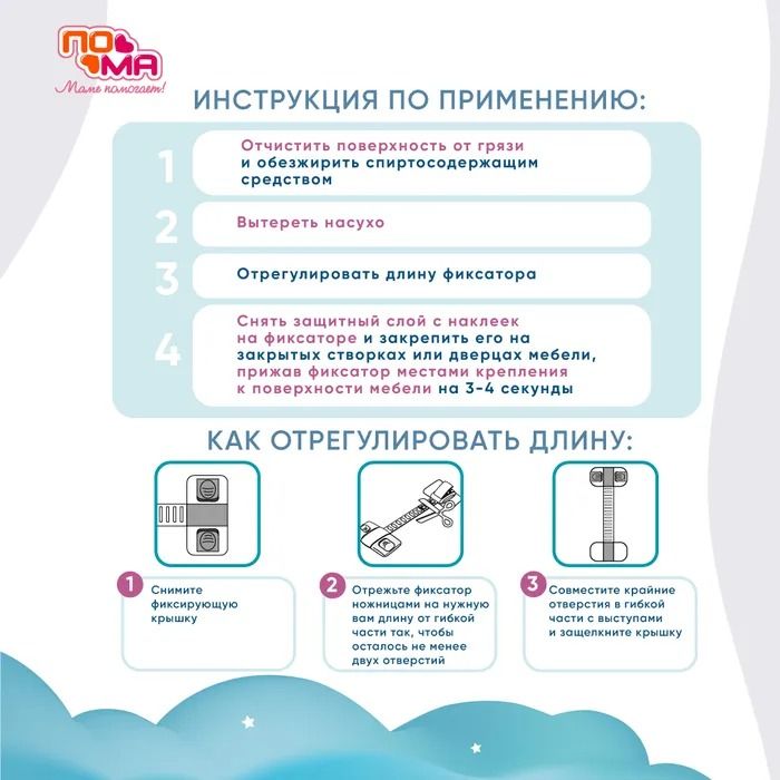 Товары серии "Безопасный Дом" разработаны так, чтобы родители могли легко использовать их для защиты своих детей от опасностей дома. На лицевой стороне упаковки изображены основные зоны использования каждого изделия. На оборотной стороне упаковки в доступной форме дана инструкция по использованию.