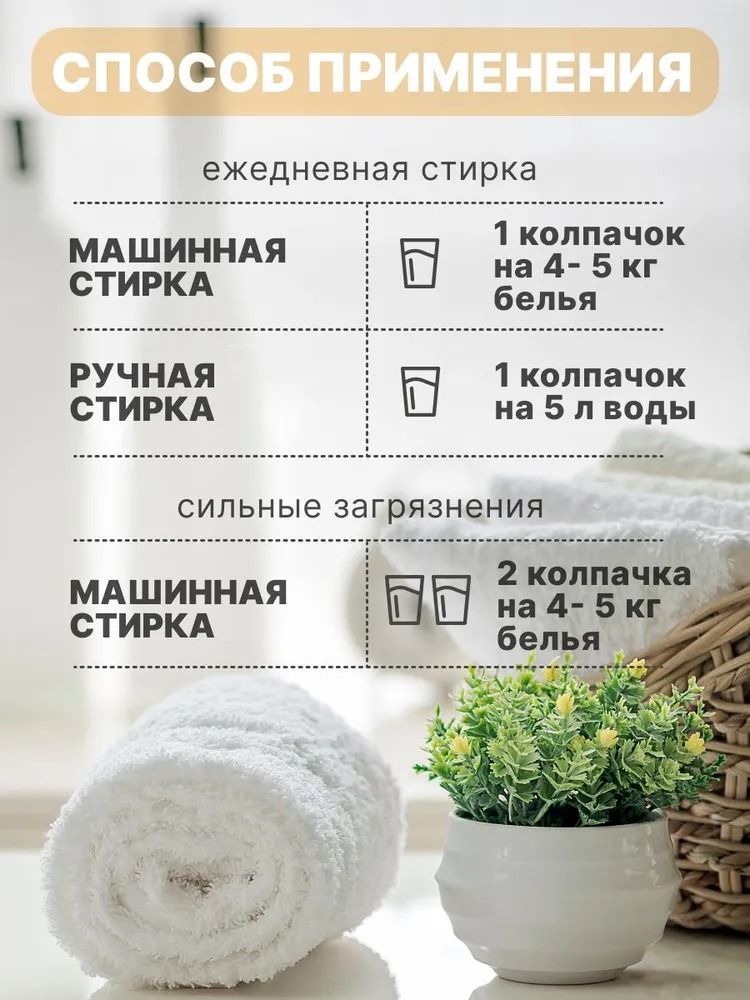 Способ применения: в отсек стиральной машины для жидких и сыпучих средств или непосредственно в барабан залить необходимое количество геля. Дозировка (расход) геля - в зависимости от степени загрязнений и жесткости воды: при обычных загрязнениях и средней жесткости воды на 5 кг белья - 1 колпачок средства; при сильных загрязнениях - 2 колпачка средства. В жесткой воде – расход геля для стирки составляет 2 колпачка на 5 кг белья независимо от степени загрязнения белья. Рекомендуемый температурный режим 40-60 °C. Не концентрат.