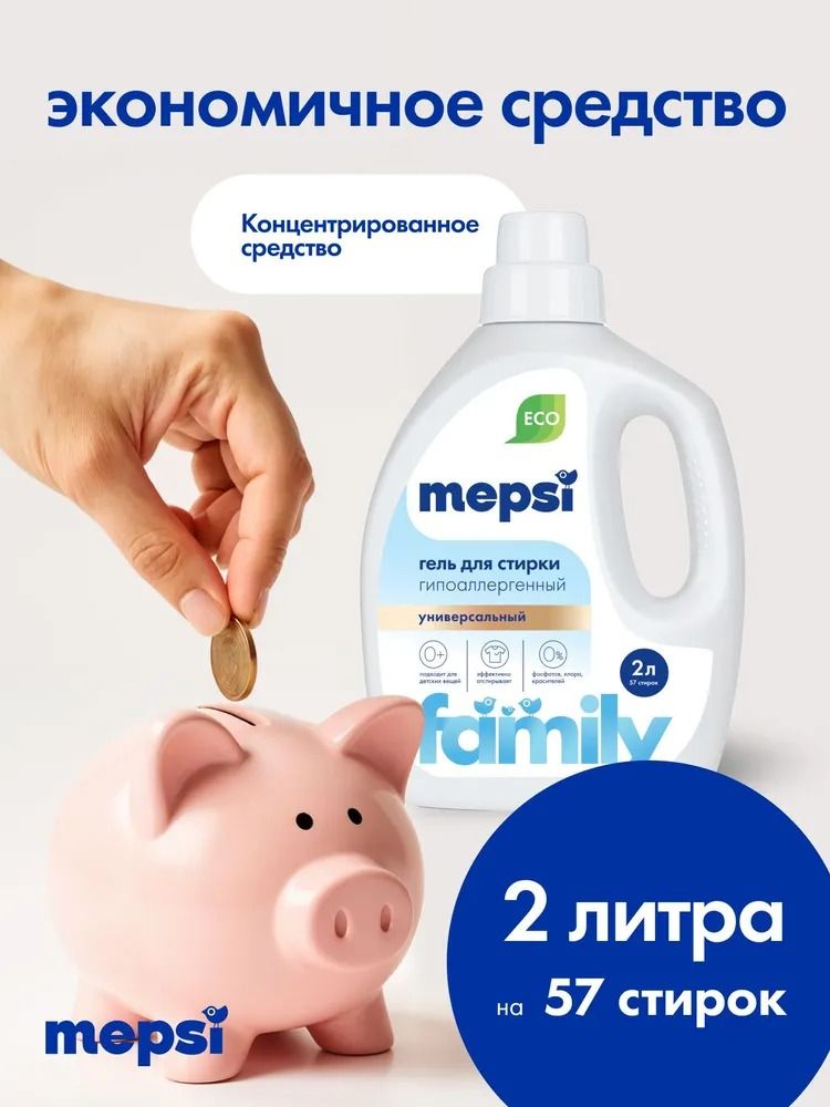 Подходит как для автоматической стирки в стиральной машине, так и для ручной стирки, при этом отличный результат вы получите даже при стирке в холодной воде. Для одной стирки достаточно небольшого количества средства. Экономичного концентрированного геля Mepsi Family хватит надолго.
