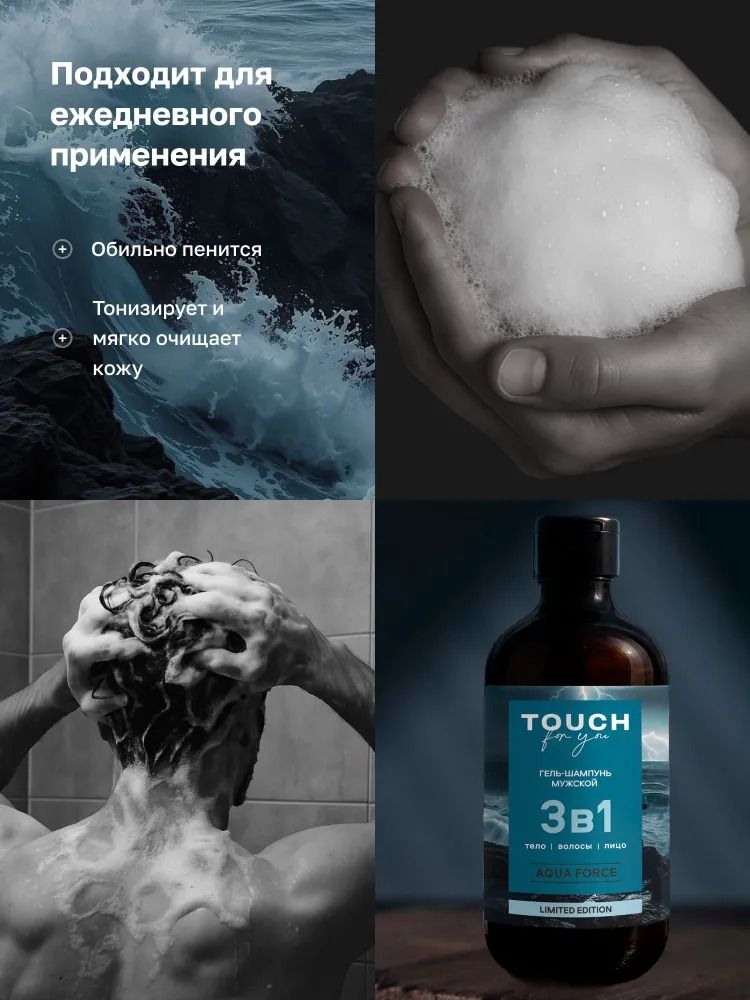 Гель-шампунь 3в1 Touch For You "AQUA FORCE" - это универсальное средство для современного мужчины, заботящегося о себе. Этот гель для душа парфюмированный предназначен для очищения, увлажнения и питания волос, тела и лица. Уникальная формула мужского шампуня, обеспечивает ощущение свежести и бодрости после каждого душа. Шампунь мужской подойдет для всех типов волос и кожи, делая его идеальным выбором для ежедневного использования. С гелем для душа "AQUA FORCE" ваша кожа и волосы будут выглядеть и чувствовать себя здоровыми и ухоженными.