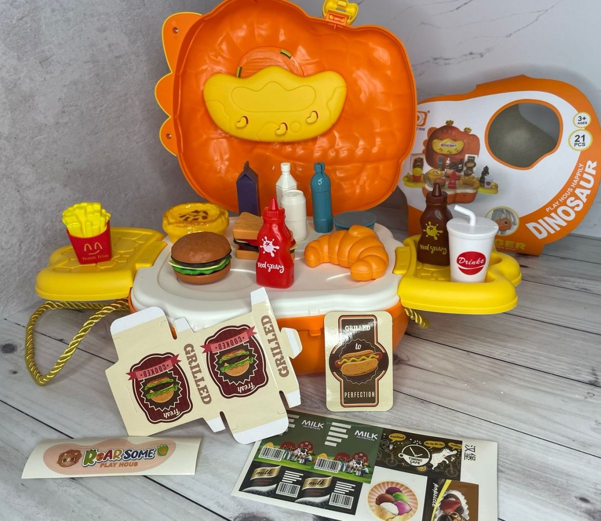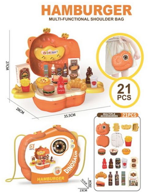 Игровой набор 2 в 1. Можно использовать сумочку для своих личных вещей, а так же можно играть и носить собой кухню на которой можно почувствовать себя настоящим шеф- поваром в своей гамбургерной. В наборе 21 предмет.