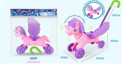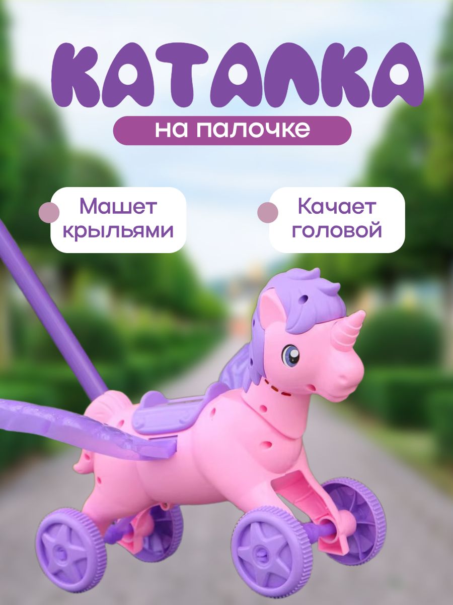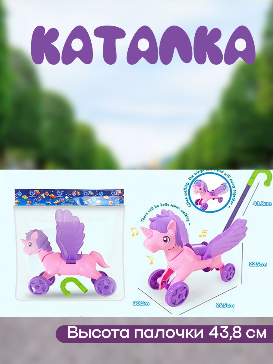 Каталка – приятная и полезная игрушка для самых маленьких! Яркая и красочная каталка представляет собой единорога на колесиках с длинной ручкой. При движении единорог машет крыльями и покачивает головой (вперед и назад).