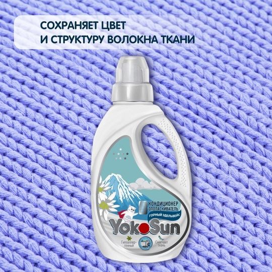 Кондиционер-ополаскиватель для белья YokoSun Горный Эдельвейс. Высокоэффективное средство, бережно ухаживающее за всеми типами ткани и придающее особую мягкость белью после стирки. Полностью выполаскивается из тканей и не остается на одежде, облегчает глажение и обладает антистатическим эффектом.