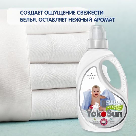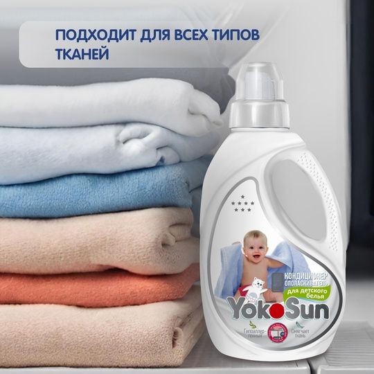 Кондиционер ополаскиватель для белья YokoSun для детского белья. Высокоэффективное средство, бережно ухаживающее за всеми типами ткани и придающее особую мягкость белью после стирки. Полностью выполаскивается из тканей и не остается на одежде, облегчает глажение и обладает антистатическим эффектом.