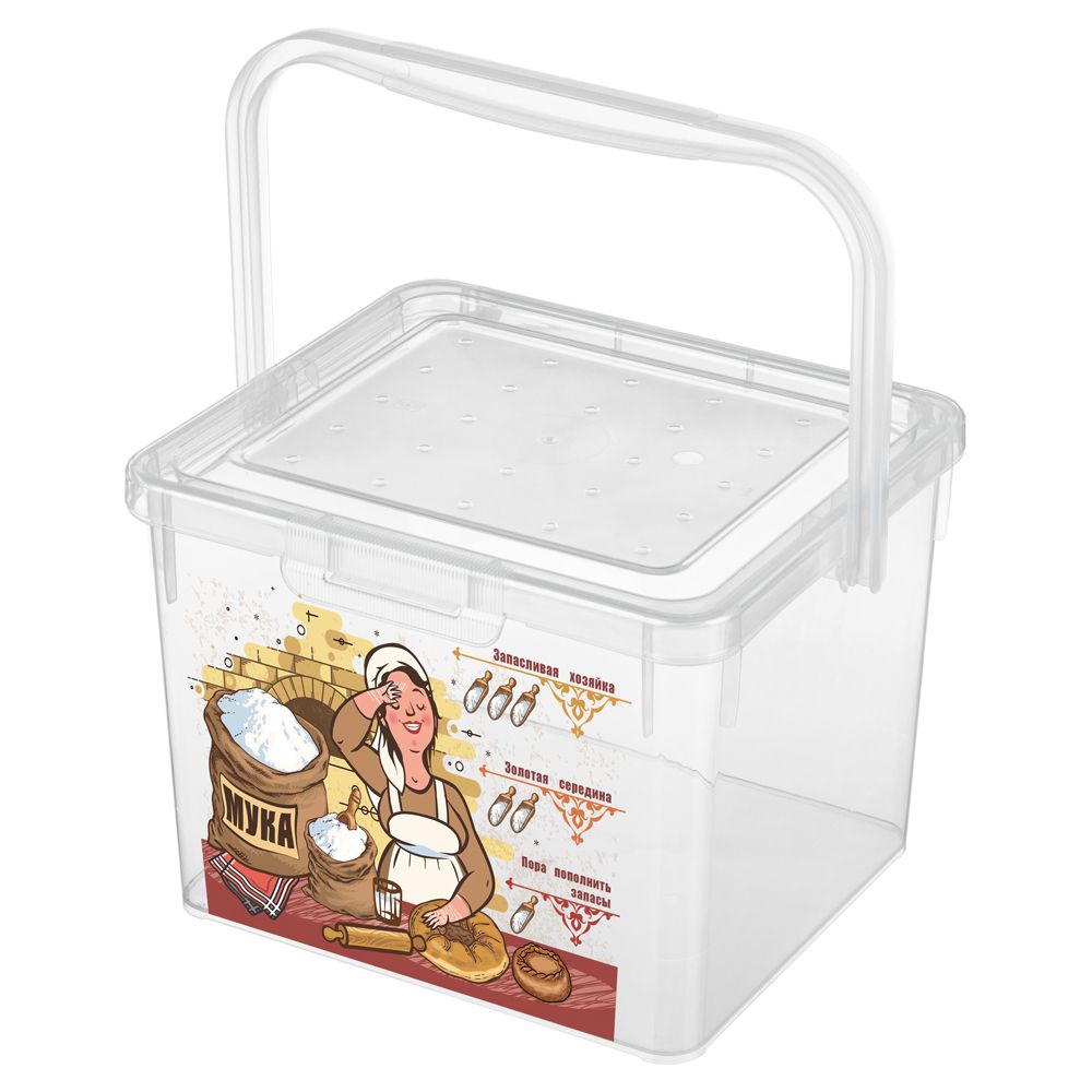 Контейнер для муки – отличная замена ненадёжным бумажным пакетам – изготовлен из безопасного полипропилена, не содержащего бисфенол А. Крышка герметично фиксируется и защищает содержимое от посторонних запахов и влаги. Прозрачный корпус позволяет следить, сколько муки осталось, а удобная прочная ручка помогает переносить контейнер с места на место. Нанесённый с помощью технологии IML декор не стирается и не повреждается в процессе использования. Контейнеры хорошо штабелируются. Бытпласт
