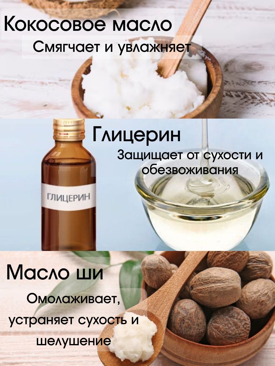 Нежное средство для очищения кожи с гипоаллергенным составом: глицерин защищает от сухости и обезвоживания, кокосовое масло смягчает и увлажняет кожу, масло ши омолаживает, устраняет сухость и шелушение (рекомендовано в составах для чувствительной и детской кожи).