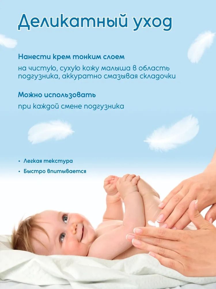 При каждой смене подгузника очистить кожу мягкой, влажной салфеткой или нежным, очищающим гелем и деликатно обсушить полотенцем. Затем нанесите тонкий слой крема в области под подгузником и кожных складок.