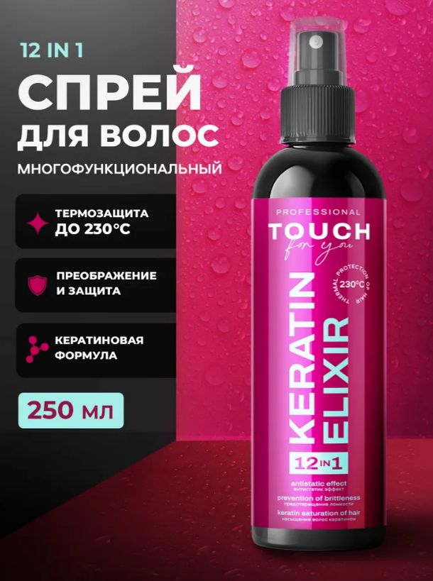 Спрей для волос термозащита Touch For You 12 в 1 это многофункциональный крем-спрей, который станет незаменимым помощником в уходе за вашими волосами. Этот неываемый спрей обеспечивает комплексную защиту и уход за волосами, делая их более сильными, блестящими и послушными. Формула спрея обогащена гидролизованным кератином, D-пантенолом и маслами макадамии, миндаля и аргании, которые питают и восстанавливают волосы, придают им блеск и мягкость. Спрей защищает волосы от термического воздействия утюжка и фена, а также от вредного воздействия солнечных лучей. Благодаря антистатическим свойствам спрея термозащиты, волосы легко расчесываются и не пушатся. Спрей для волос это идеальное решение для тех, кто хочет получить здоровые, сильные и блестящие волосы.