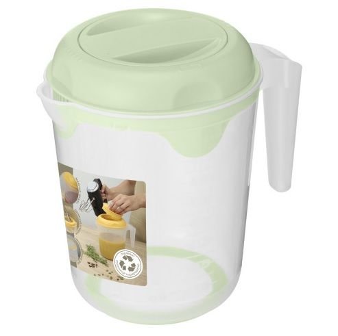Кувшин для блендера (миксера) удобно использовать для взбивания сливок, приготовления теста, блюд из творога, супов-пюре, ягодных и фруктовых десертов, различных соусов и детского питания. Благодаря особой форме крышки продукты при взбивании не разбрызгиваются. Специальное покрытие из эластомера на дне кувшина предотвратит скольжение по столу. Мерная шкала на корпусе позволит отмерить нужное количество воды. Кувшин можно использовать также для хранения или разогревания в микроволновой печи уже приготовленных блюд. Отверстие в крышке плотно закрывается при помощи вставки, что исключает возможность заветривания содержимого кувшина. Вставка имеет удобную ручку для открывания. Основание крышки имеет три положения: открытое для переливания жидкости, сито для процеживания крупных кусочков и закрытое.