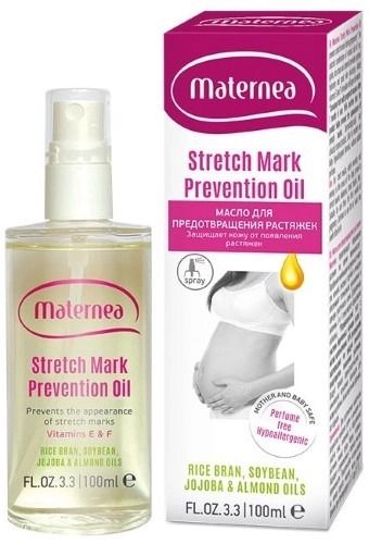 Масло для предотвращения растяжек Maternea предотвращает образование растяжек во время беременности*. Подобранная комбинация натуральных масел сои, жожоба, рисовых отрубей и миндаля обеспечивает оптимальное увлажнение и хорошую эластичность кожи. Добавленные витамины E и F стимулируют образование коллагена. *Потребительский тест с участием беременных женщин после 1 месяца использования: 96% респондентов подтверждают, что продукт помогает предотвратить появление растяжек.