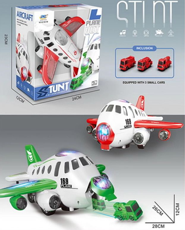 Режим второй. В верхней части есть отсек для машинок, открываем крышку, помещаем машинки. При работе второго режима крышка отсека в носовой части будет открываться, машинки станут выезжать, самолет издает звуки взлета самолета, подсветка, едет вперед, при столкновении с препятствием разворачивается и едет в произвольном направлении.