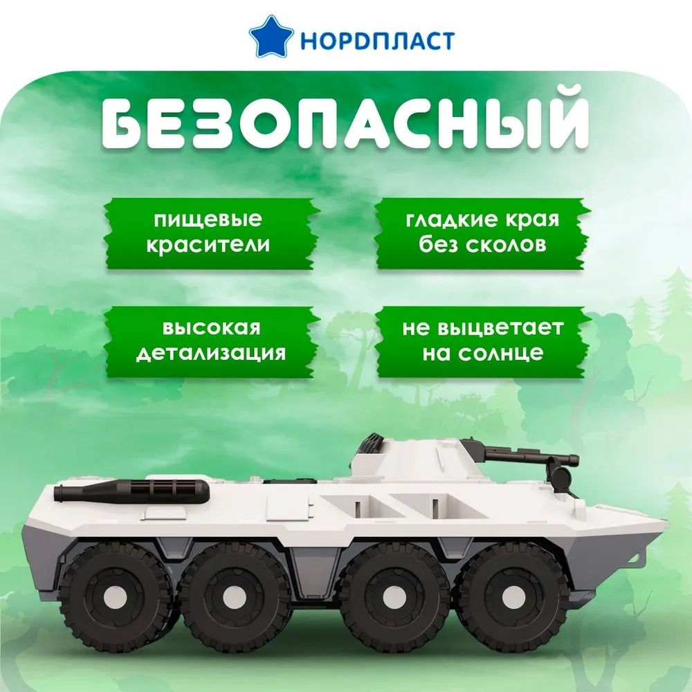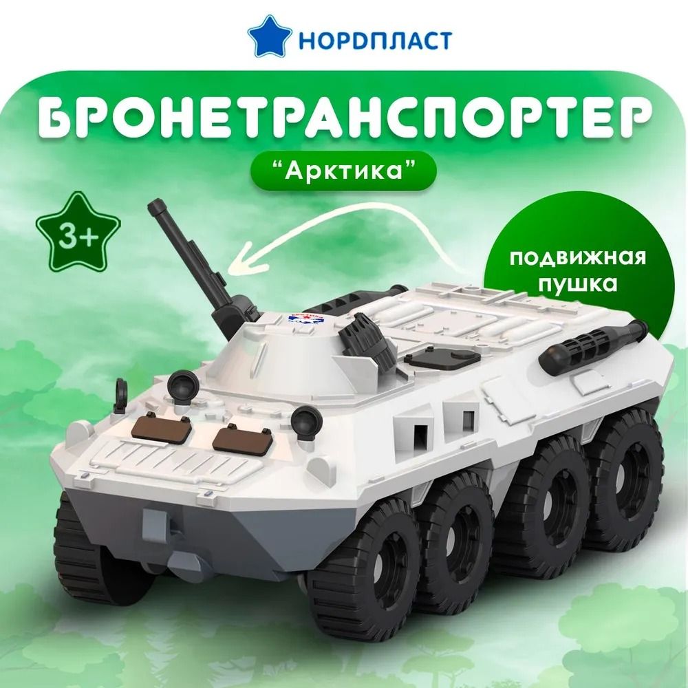 Машинка игрушка для мальчика Бронетранспортер "Арктика". Особенное место среди игрушек компании Нордпласт занимает военная линейка продукции. Она производится уже более 15 лет. Основное отличие - это доскональная деталировка машинок, функциональность и узнаваемость, поскольку многие из них имеют реальные прототипы в российской армии. С помощью машинок маленькие ценители знакомятся с существующим военным транспортом, их особенностями и принципом действия, развивают мелкую моторику, воображение, и могут устраивать целые сражения! Машинка Бронетранспортер имеет устойчивую проходимую базу из 4-х пар крутящихся колес, движущееся орудие, как у танка, что делает игру еще реалистичнее и увлекательнее.