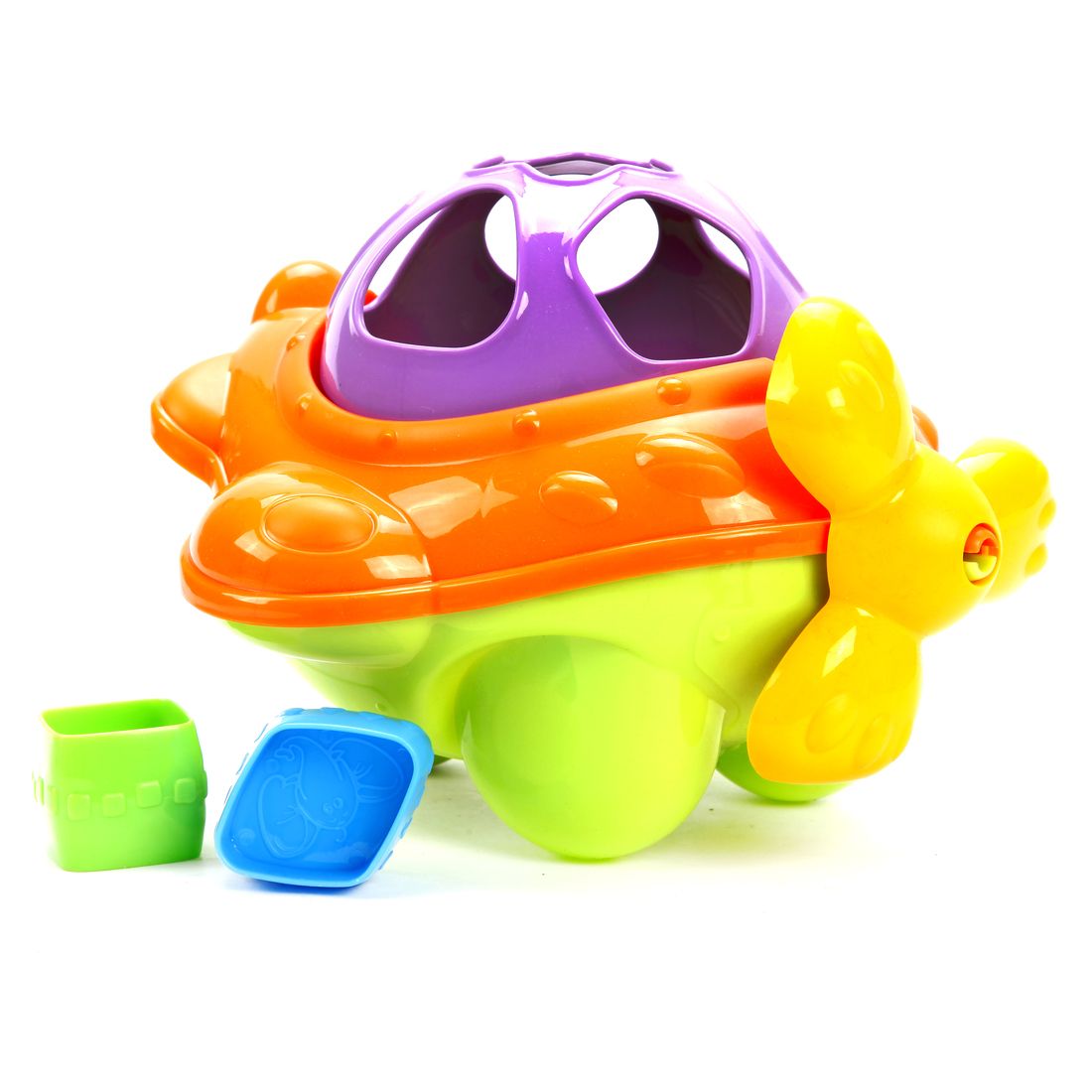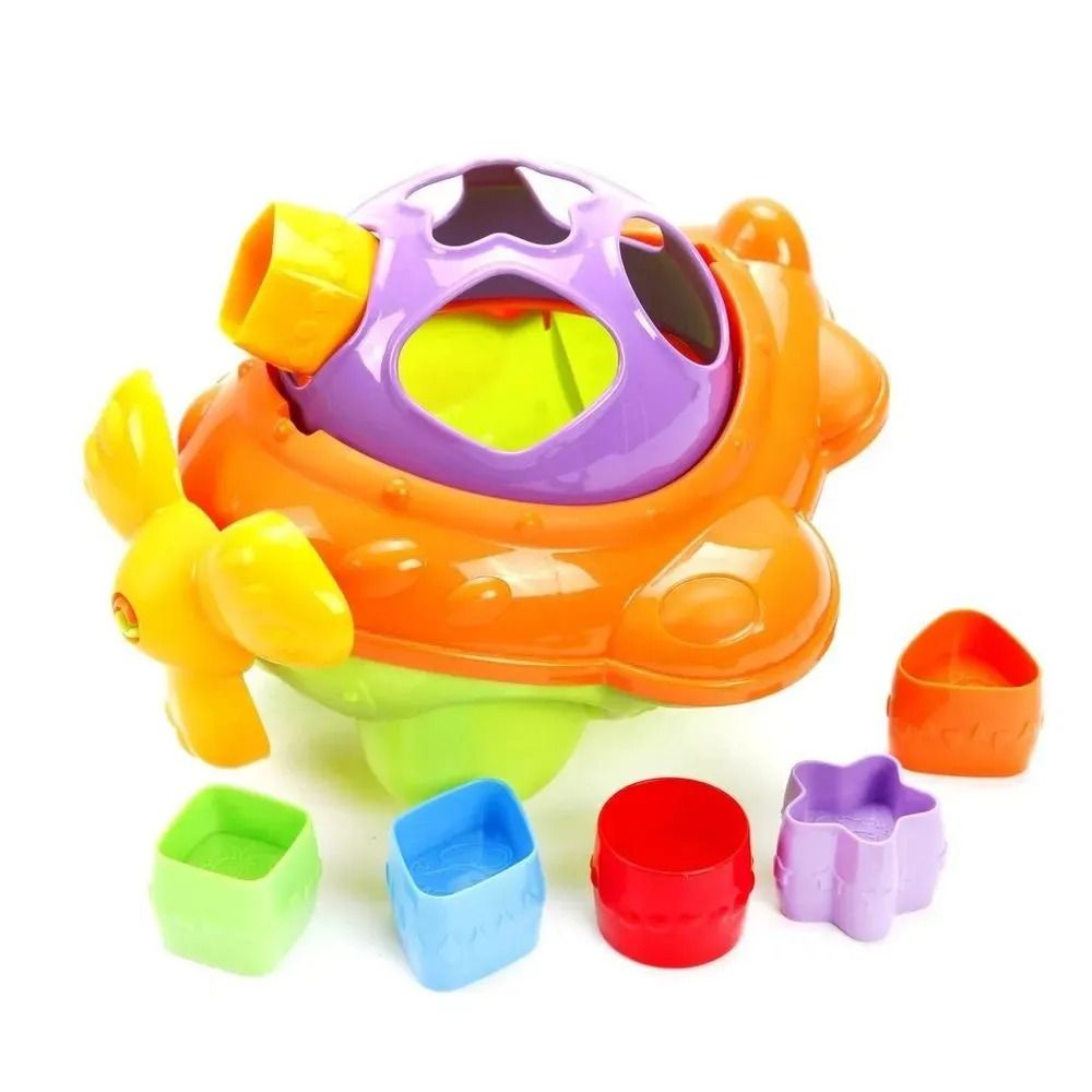 Игрушка выполнена в форме цветного самолетика, на борту которого проделаны отверстия различной формы.