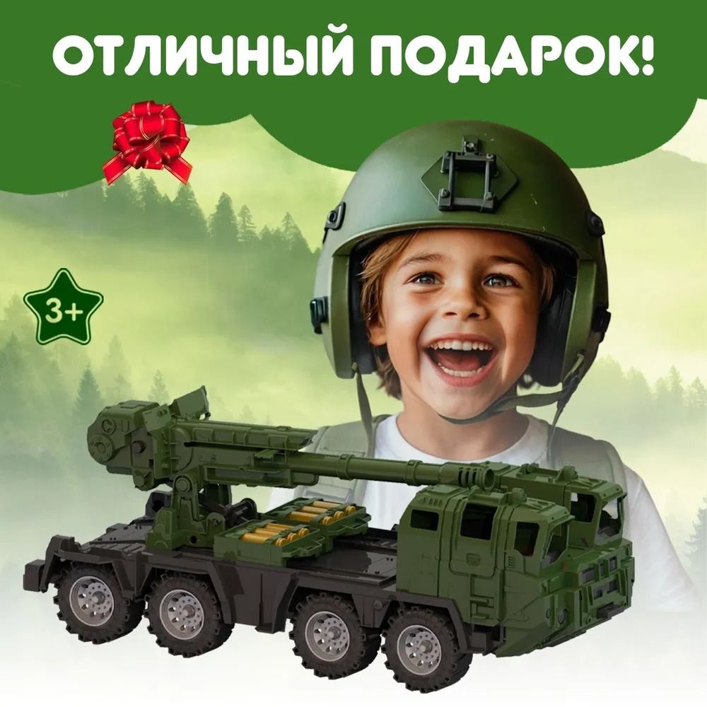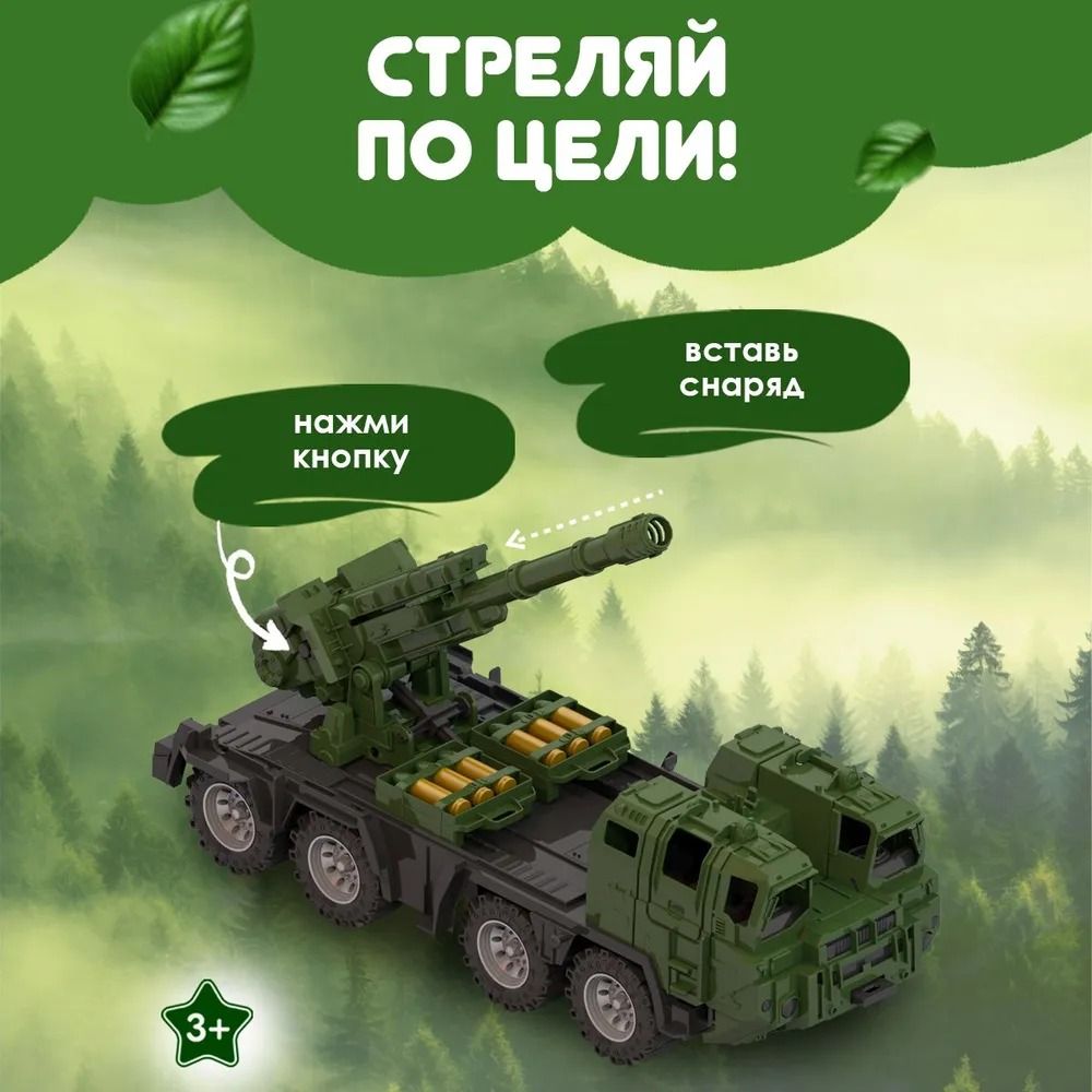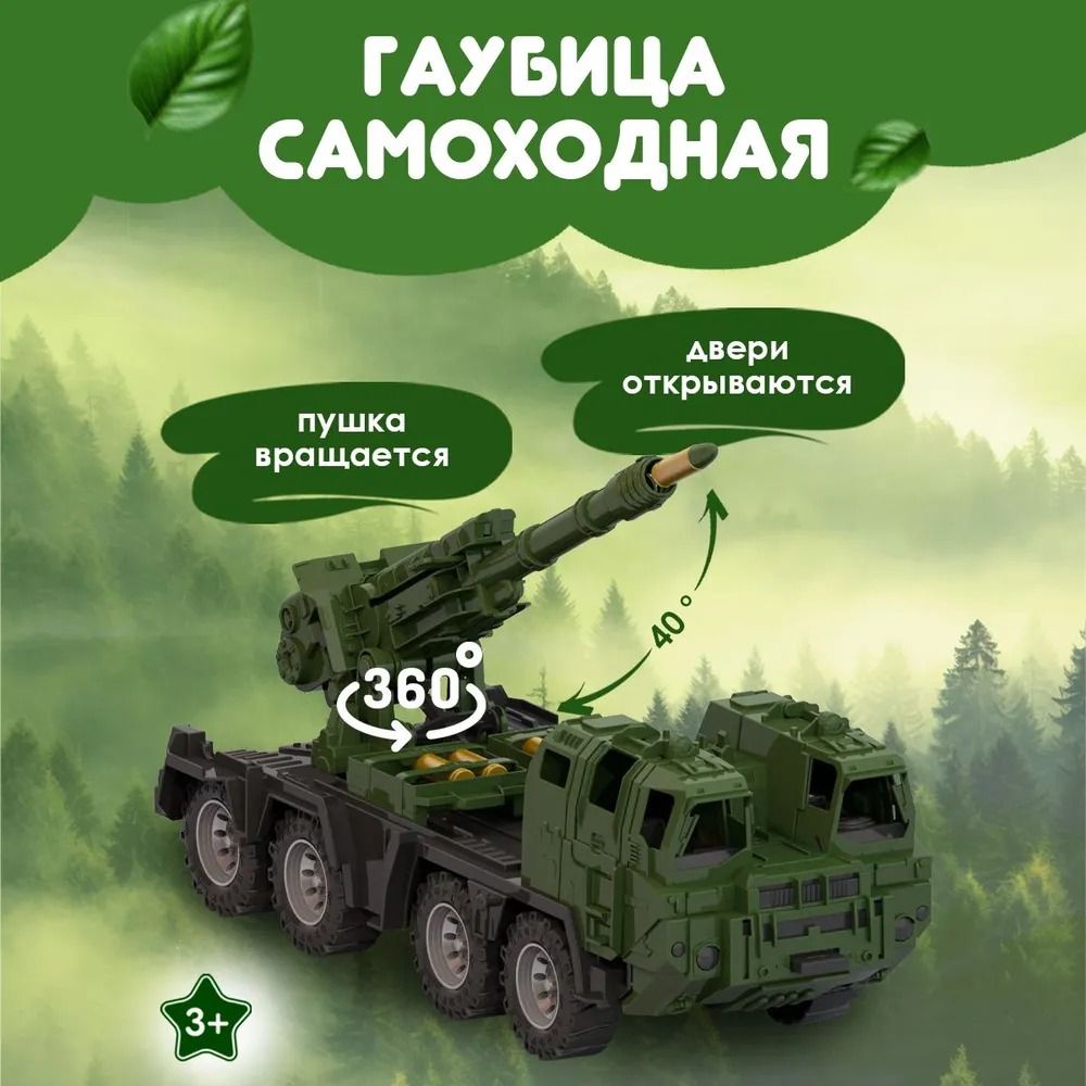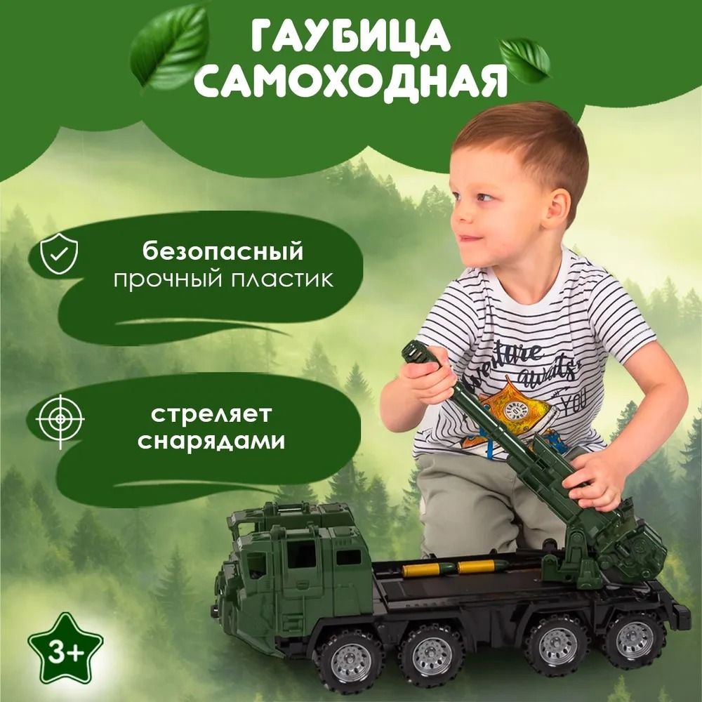Большая военная машина гаубица самоходная со снарядами - новинка военной серии от Нордпласт. Военный тягач оснащен двумя кабинами. На открывающихся дверцах методом тампопечати нанесен рисунок. Тягач передвигается на четырех колесных парах на металлических осях. Гаубица интересна не только тем, что она похожа на настоящее военное орудие, но и тем, что она действительно способна стрелять снарядами. Гаубица со снарядами создана из качественного и легкого пластика, так что игрушка безопасна в применении. Ствол орудия может подниматься, опускаться и поворачиваться, так что при желании можно стрелять по мишеням. Военная игрушка оснащена двумя кабинами с открывающимися дверьми. В комплекте 2 ящика с боеприпасами.