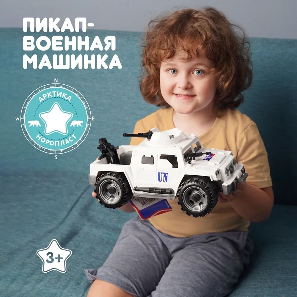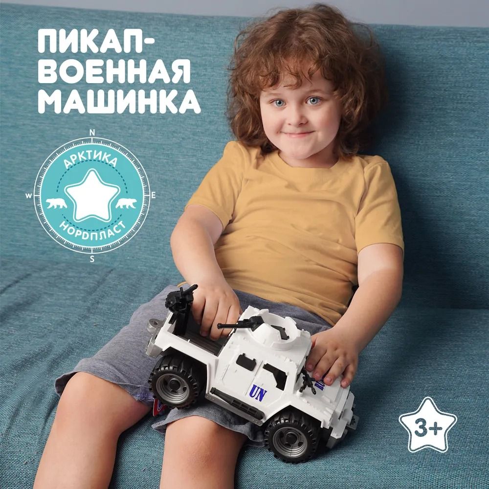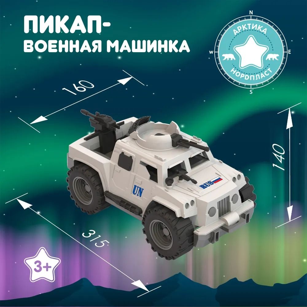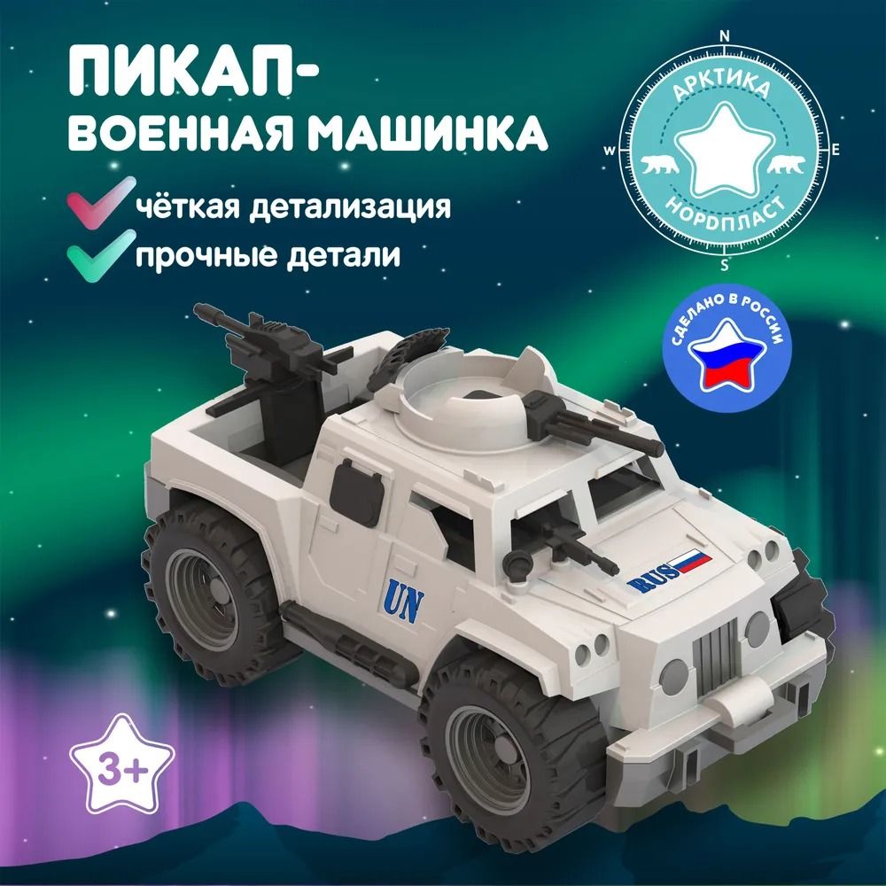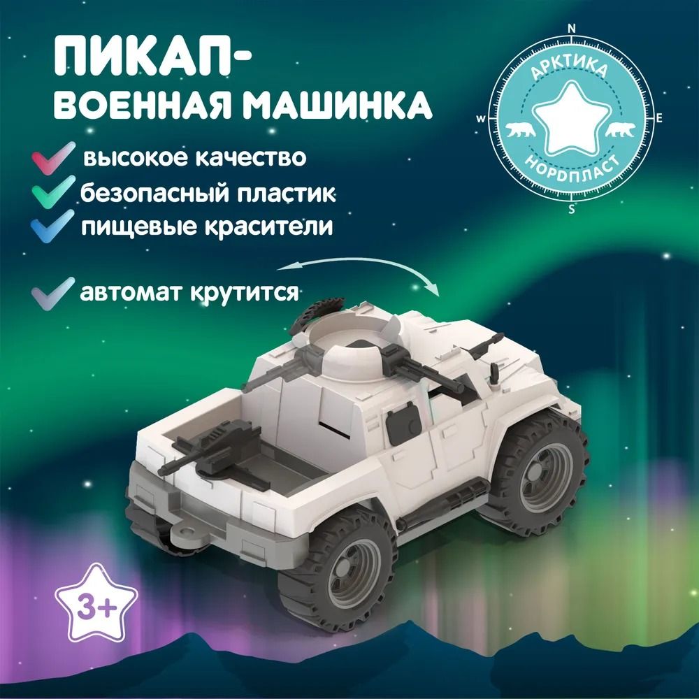 Особенное место среди игрушек компании Нордпласт занимает военная линейка продукции для мальчиков. Основное отличие - это доскональная деталировка машинок, функциональность и узнаваемость, поскольку многие из детских машинок имеют реальные прототипы в российской армии. С помощью военной техники Нордпласт маленькие ценители знакомятся с существующим военным транспортом, их особенностями и принципом действия, развивают мелкую моторику, воображение и могут устраивать целые сражения. Безопасный прочный пластик, четкая деталировка, особенная цветовая гамма, надежное крепление подвижных деталей. Реалистичный дизайн данных моделей позволит с головой погрузиться в игру, придумывая новые интересные сюжеты. Кроме того, эти игрушки познакомят малыша с видами военной техники. Пикап "Миротворец" отлично вооружен: в передней и задней части установлены автоматы, башня с пулеметом на крыше крутится.