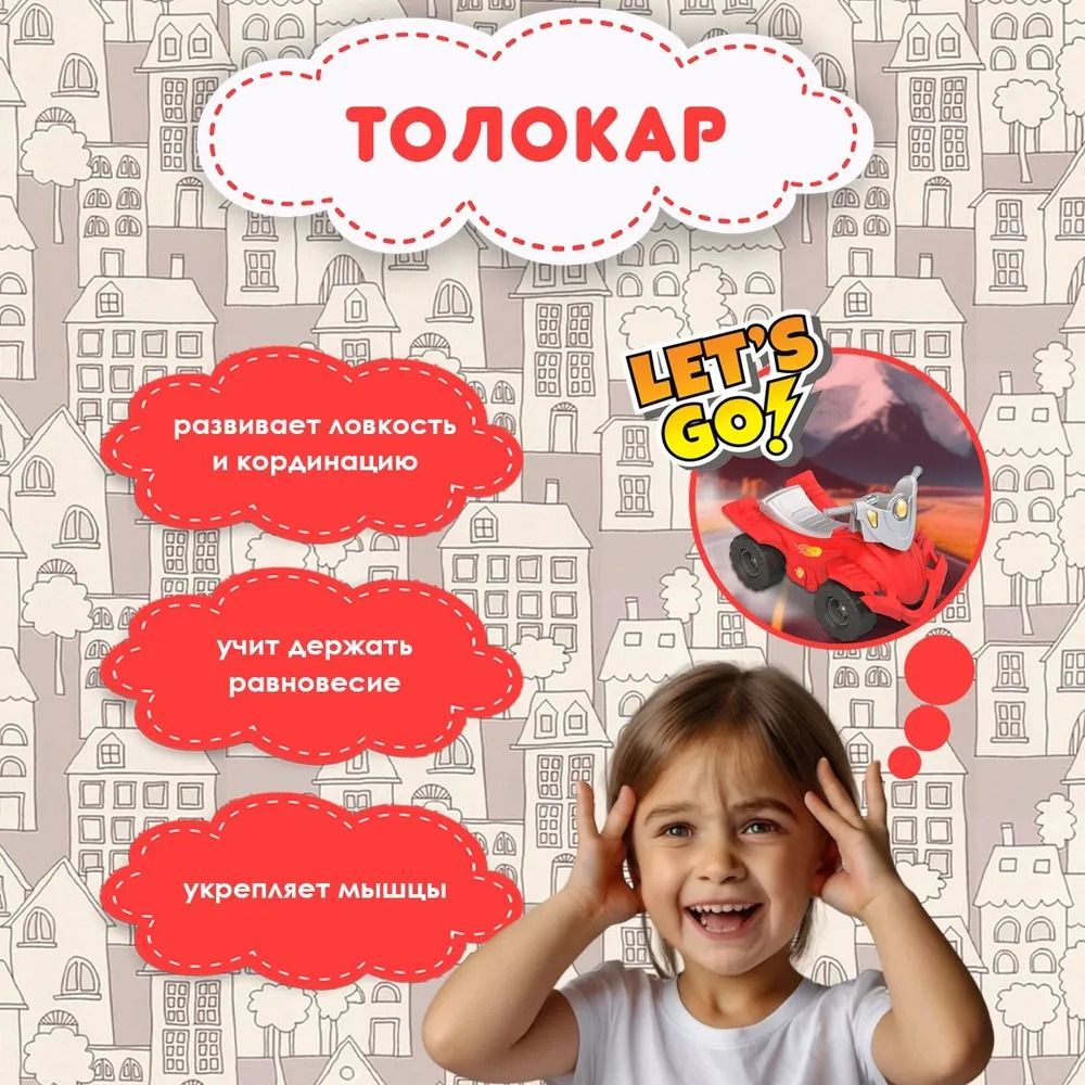 Термопечать, используемая вместо наклеек, обеспечивает долговечность рисунка в течение всего срока эксплуатации. Руль, шероховатое покрытие на сиденье для предотвращения скольжения, а также мощные рельефные колеса, обеспечивающие отличное сцепление и устойчивость, делают эту каталку пушкар идеальной для развития фантазии, координации движений, управления и пространственного мышления ребенка.