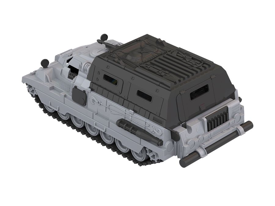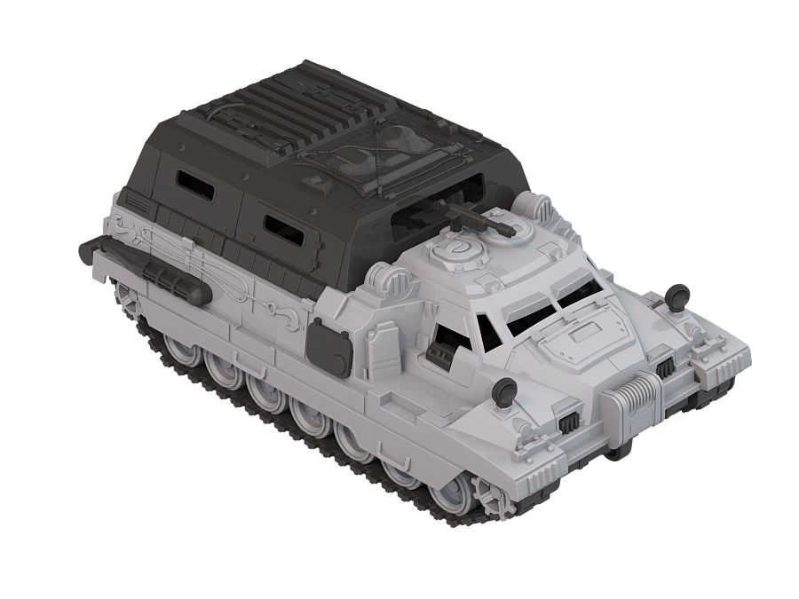 Вездеход двигается на скрытых колесах (гусеницы неподвижны), пушка над кабиной водителя подвижна, крышка над заправочным отсеком поднимается.