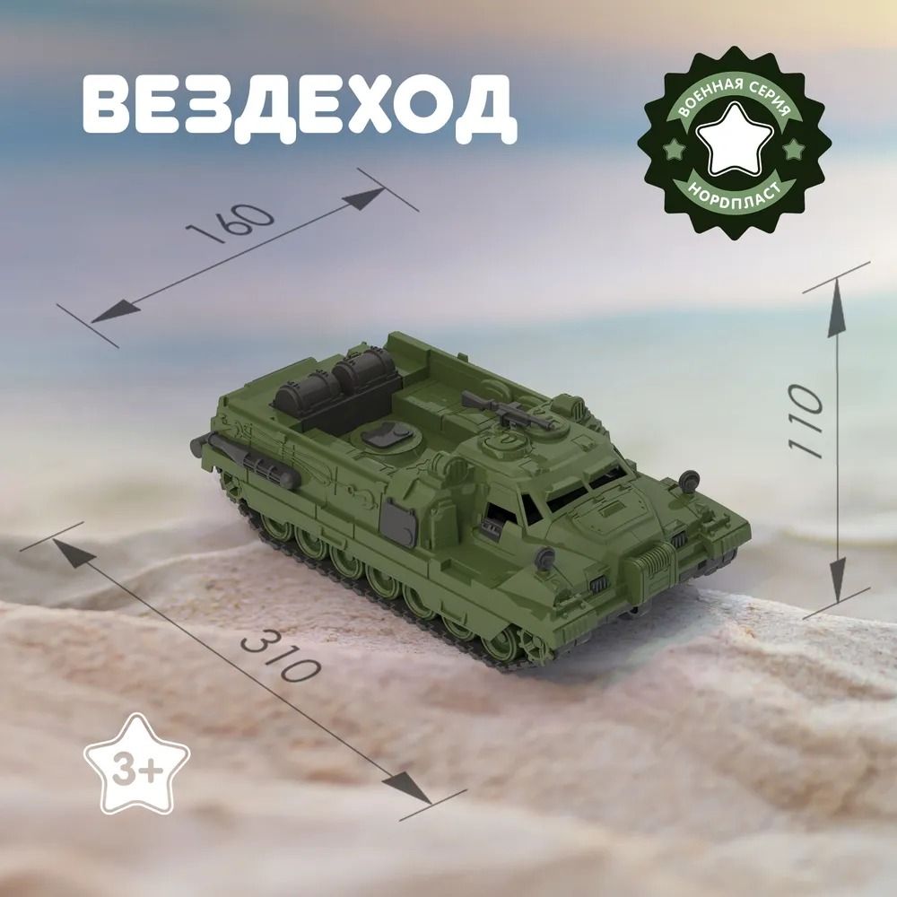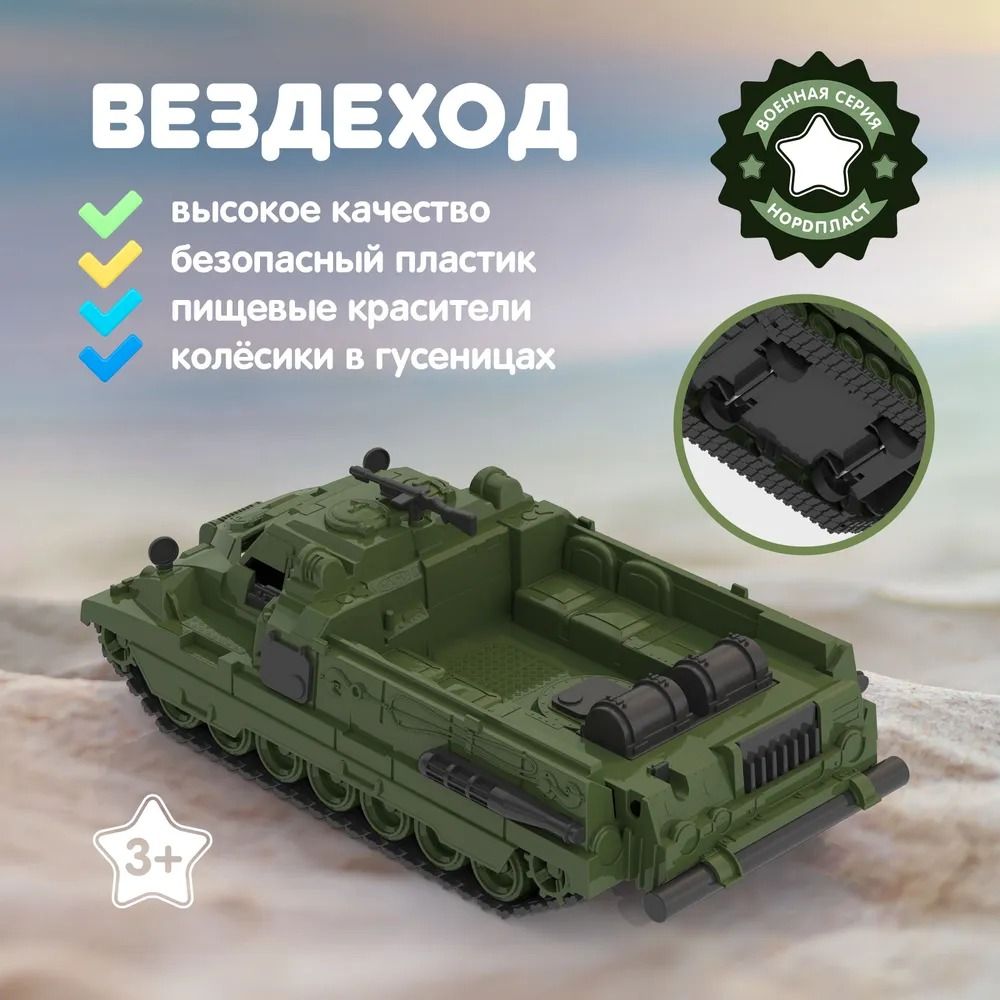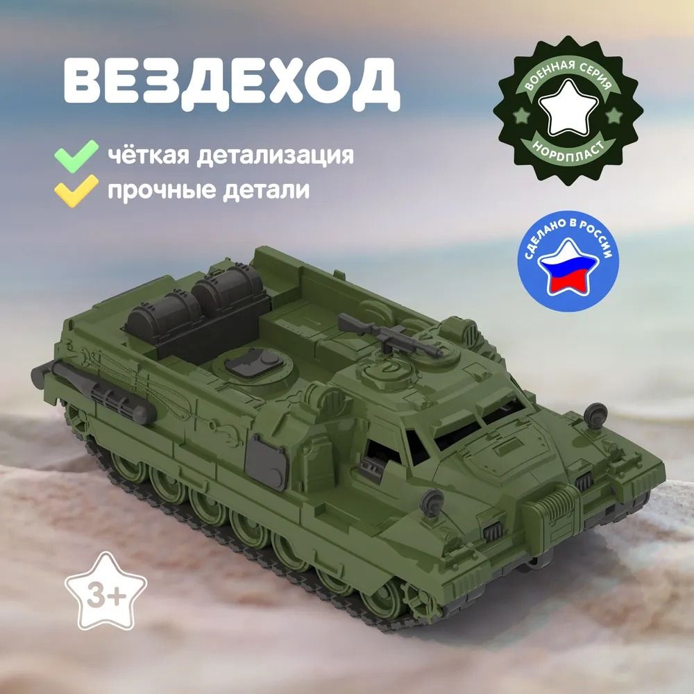Машинка детская игрушка для мальчика и девочки вездеход Страж. Основное отличие - это доскональная деталировка машинок, функциональность и узнаваемость, поскольку многие из них имеют реальные прототипы в российской армии. С помощью машинок маленькие ценители знакомятся с существующим военным транспортом, их особенностями и принципом действия, развивают мелкую моторику, воображение, и могут устраивать целые сражения! Вездеход двигается на скрытых колесах (гусеницы неподвижны), пушка над кабиной водителя подвижна. Выбирайте набор машинок детям в сад или школу для весёлого времяпрепровождения. Машинка игрушка - это отличный подарок для ребенка на новый год, день рождения и любой другой праздник! Подойдет в подарок для мальчика. Машинки детские также подходят для игры на улице. Российская пластмассовая игрушка для детей достойного качества - правильный выбор родителей! Сделано в Санкт – Петербурге на заводе Нордпласт. Все игрушки производства Нордпласт отличаются высокой износоустойчивостью.
