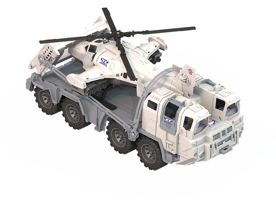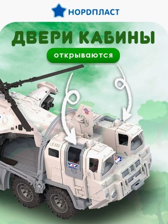 Машинка игрушка для мальчика тягач с военным вертолетом - это сразу две игрушки в одной! Тягач имеет опускающуюся складывающуюся аппарель. Двери открываются. Вертолет крепится тремя функциональными пластиковыми крепежными элементами. В самом вертолете лопасти складываются, а люк в хвосте открывается. Военная машина тягач оснащена двумя кабинами, на открывающихся дверцах методом тампопечати нанесен рисунок.