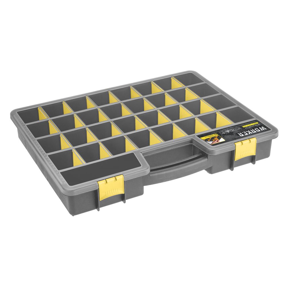 Органайзер для строительных материалов линейки "WORKER" поможет рассортировать крепежные и другие материалы: саморезы, гвозди, дюбели, болты, винты и пр. Внутри органайзера - съёмные подвижные разделители, с помощью которых при необходимости можно сформировать ячейки нужного размера. Прочные замки не позволят органайзеру раскрыться и просыпать содержимое. Благодаря цельной округлой ручке органайзер удобно переносить или снимать с полки. Прозрачная крышка позволяет видеть, что именно хранится внутри. Изготавливается из 100% перерабатываемого прочного безопасного полипропилена, не боится влажности и перепадов температур, легко моется. Бытпласт