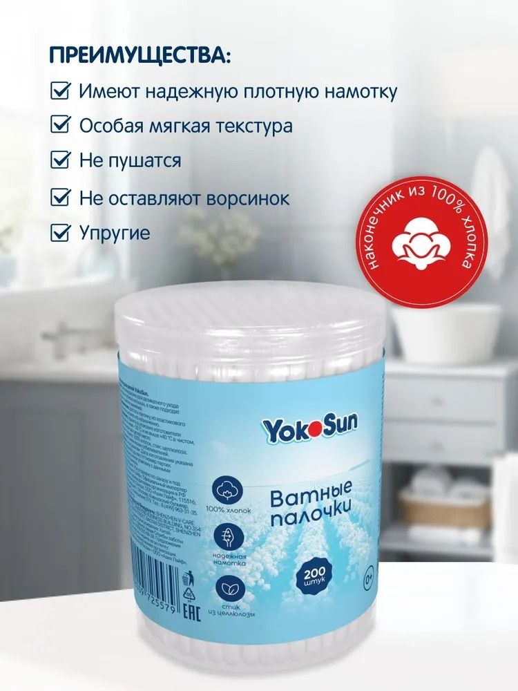 Ватные палочки YokoSun. Благодаря плотной намотке ватных подушечек, хлопковые волокна не отслаиваются. Подходят для ежедневного применения в гигиенических и косметических целях. Разработаны с учетом особенностей кожи, не вызывают аллергии и раздражения.