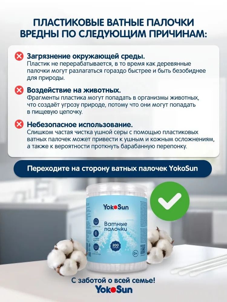 Читать все статьиПалочки ватные экологичные YokoSun, без ограничителя, 200 шт.