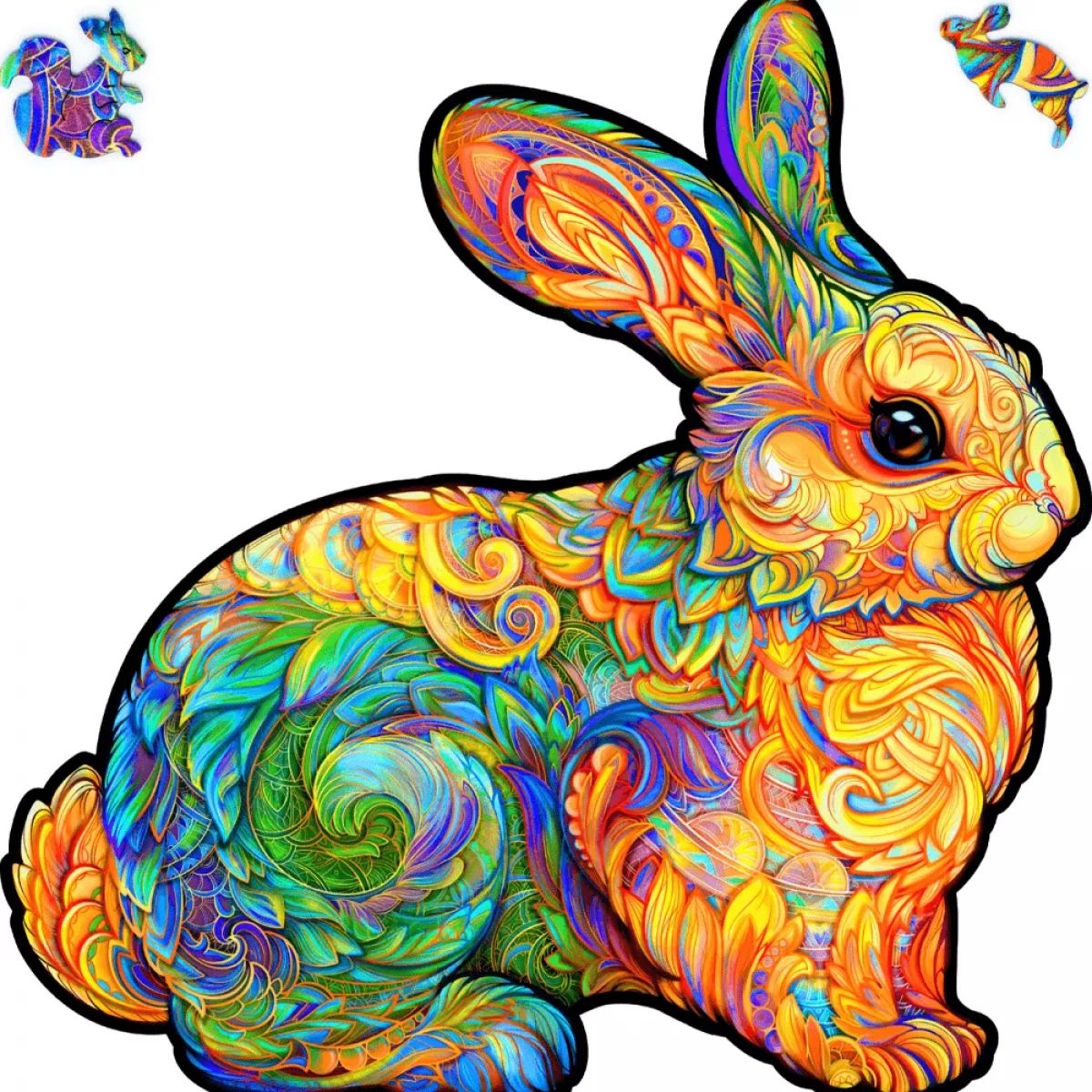 Кролики — животные скромные, но наш братец не такой как все. Он яркий, у него драгоценная шерстка и он скрывает в себе целый сказочный мир. В нем есть и морковки, и разнообразные животные. Собирать этот пазл будет очень приятно и увлекательно, особенно при условии, что спешить некуда. Ведь этот не тот кролик, который опаздывает на прием к королеве, а Драгоценный Кролик от Unidragon.