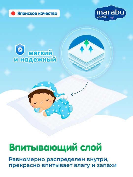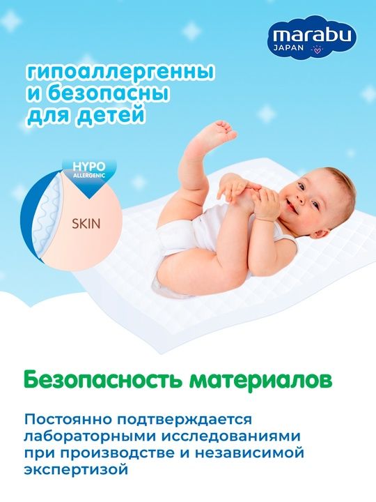 Пеленки одноразовые от Marabu - гарантия чистоты, сухости и комфорта! Благодаря инновационному Японскому абсорбенту, одноразовые пеленки способны быстро впитывать большое количество жидкости и надежно запечатывать влагу, что избавит от необходимости замены после однократного намокания. Непромокаемая пеленка имеет настолько нежный верхний слой, что подойдет даже чувствительным малышам, кожа которых требует трепетной заботы. Пеленки для новорожденных станут незаменимым помощником в быту любой мамы, так как помогут дополнительно защитить коляску, кроватку или сидение автомобиля от протекания, а также обеспечат маме и малышу комфорт при воздушных ваннах. Пеленки одноразовые 60*60 имеют универсальный размер и подходят для использования в том числе как: пеленки для собак, пеленки для взрослых, пеленки для животных.