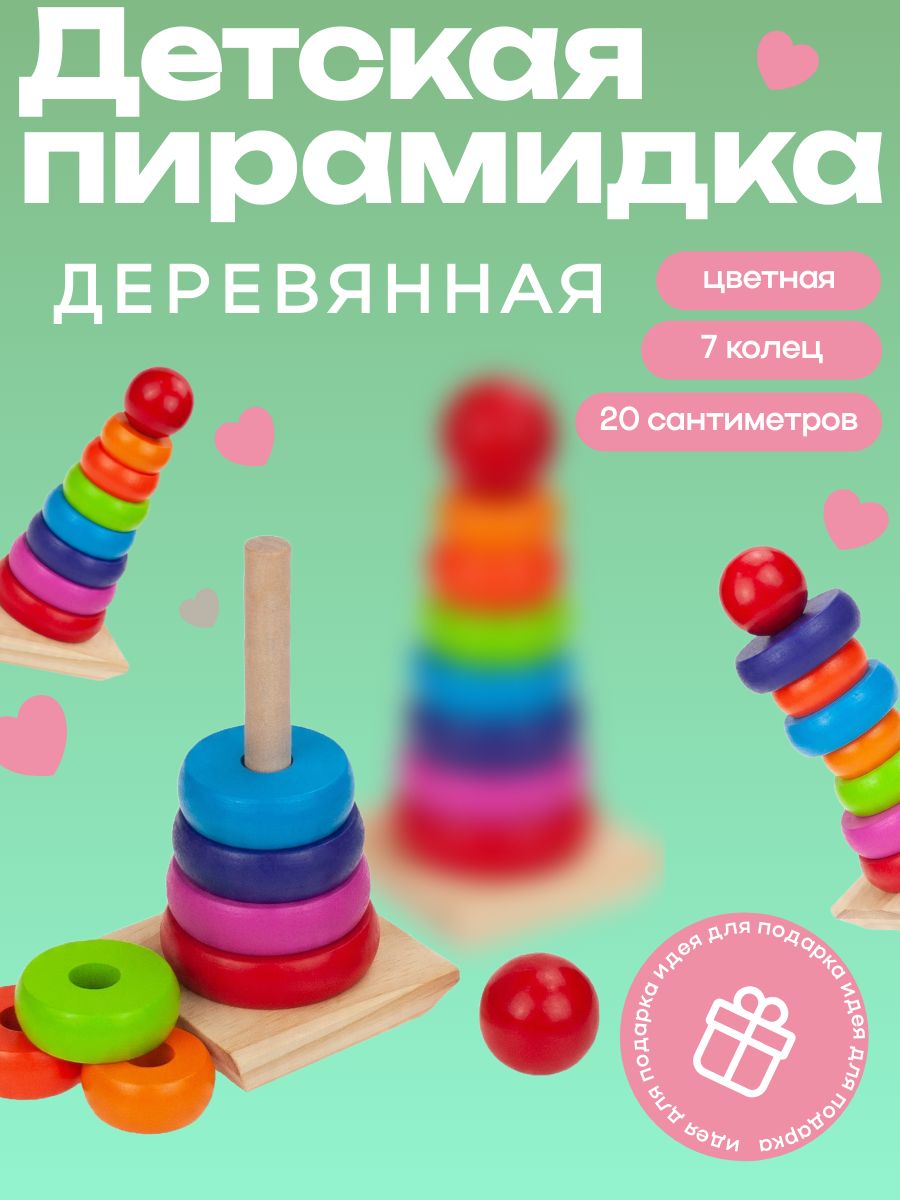 Читать все статьиПирамидка деревянная цветная 7 колец, 20см, в коробке