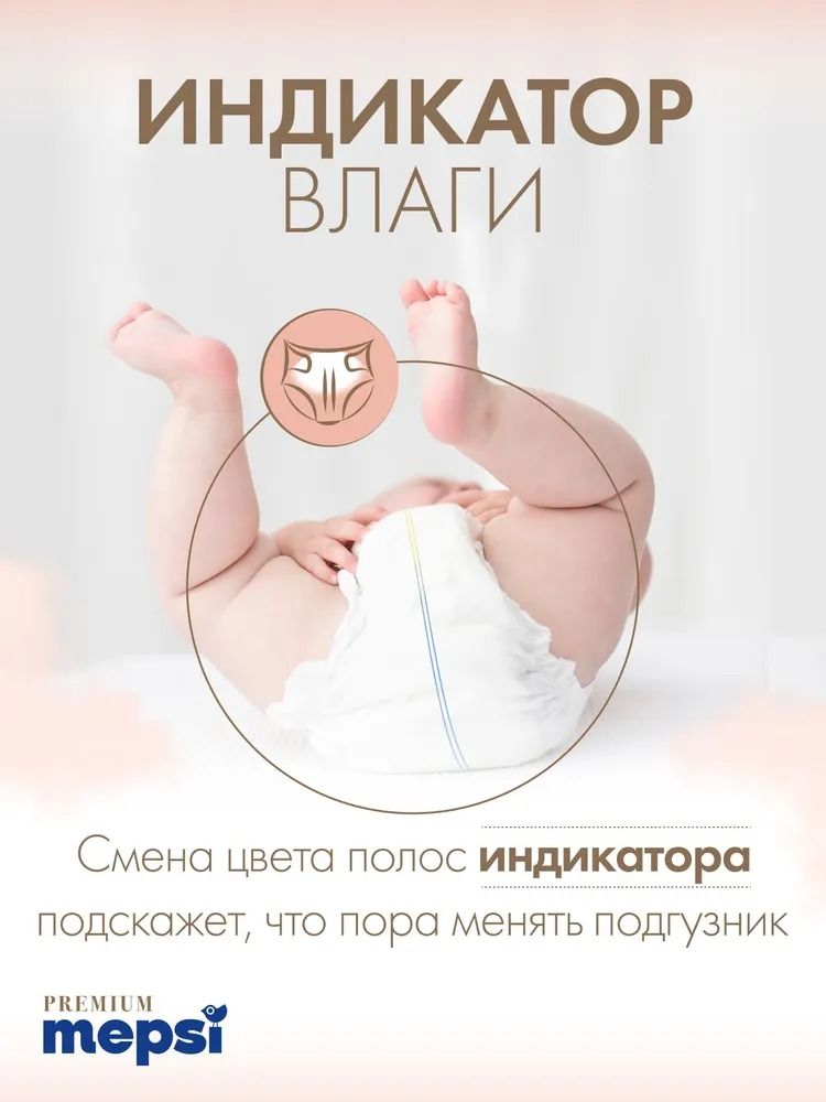 Памперсы для новорождённых 1 размера от Mepsi имеют удобный индикатор влаги, который упрощает уход, а воздушные каналы предотвращают опрелости.