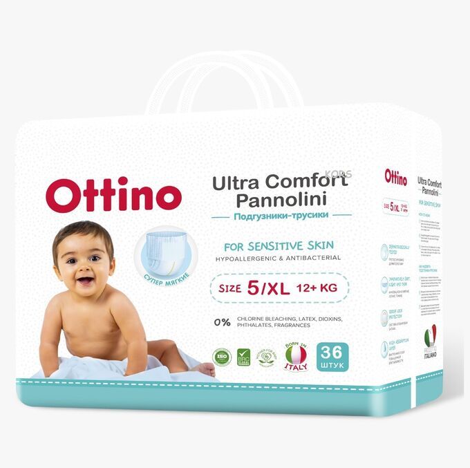 Читать все статьиПодгузники-трусики Ottino, XL (12+ кг), 36 шт