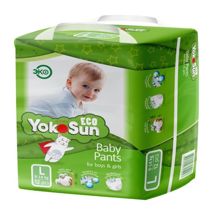 Читать все статьиПодгузники-трусики детскиеYokoSun Eco, L (9-14 кг), 12 шт.