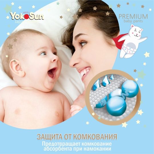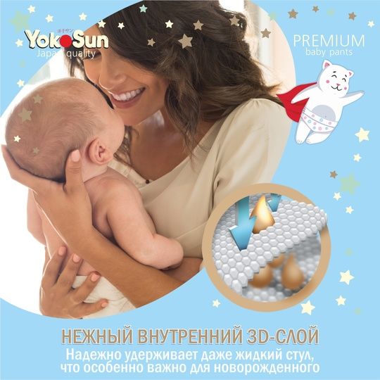 Трусики-подгузники YokoSun серии Premium – это новая линейка полюбившихся многим родителям подгузников YokoSun. Они отвечают всем требованиям современных мам и дарят до 12 часов спокойного сна.