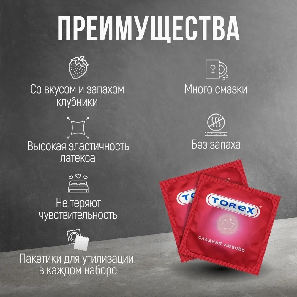 ПРЕЗЕРВАТИВЫ TOREX СЛАДКАЯ ЛЮБОВЬ не только надёжно защищают от заболеваний, передающихся половым путём, и от нежелательной беременности, но и благодаря клубничному аромату вносят дополнительную пикантность и разнообразие в отношения. Используемый ароматизатор является пищевым. Презервативы подходят для любого вида секса: вагинального, анального, орального, с применением интимных игрушек.Благодаря тонкой стенке (0,06 мм) сохраняется естественность ощущений. Размер презерватива (190х55 мм) обеспечивает комфортное надевание и использование. Презервативы Torex производятся из натурального латекса на современном автоматизированном оборудовании и проходят многоступенчатый контроль качества (в том числе электронную проверку герметичности).Каждый презерватив обильно смазан гипоаллергенным силиконом для лёгкого и приятного проникновения. Индивидуальные блистеры имеют зубчики, обеспечивающие удобное открывание без использования острых предметов. Презервативы комплектуются непрозрачными пакетами для утилизации со скотч-полосой. Это позволяет сохранить тайну отношений и избежать лишних вопросов от окружающих. Клубничные презервативы Torex производятся в экологичной упаковке из картона без использования полимерной слюды. Упаковка заклеена и имеет надёжный контроль первого вскрытия.