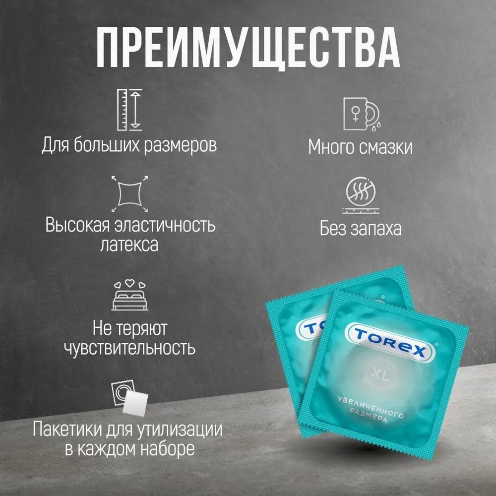 ПРЕЗЕРВАТИВЫ TOREX УВЕЛИЧЕННОГО РАЗМЕРА имеют большую длину (200 см) и ширину (56 мм). Они максимально удобны в использовании. Надёжно защищают от заболеваний, передающихся половым путём (в том числе ВИЧ).Презервативы Torex производятся из натурального латекса на современном автоматизированном оборудовании и проходят многоступенчатый контроль качества (в том числе электронную проверку герметичности). Каждый презерватив обильно смазан гипоаллергенным силиконом для лёгкого и приятного проникновения.Индивидуальные блистеры имеют зубчики, обеспечивающие удобное открывание без использования острых предметов. Презервативы комплектуются непрозрачными пакетами для утилизации со скотч-полосой. Это позволяет сохранить тайну отношений и избежать лишних вопросов от окружающих.Презервативы Torex производятся в экологичной упаковке из картона без использования полимерной слюды. Упаковка заклеена и имеет надёжный контроль первого вскрытия.