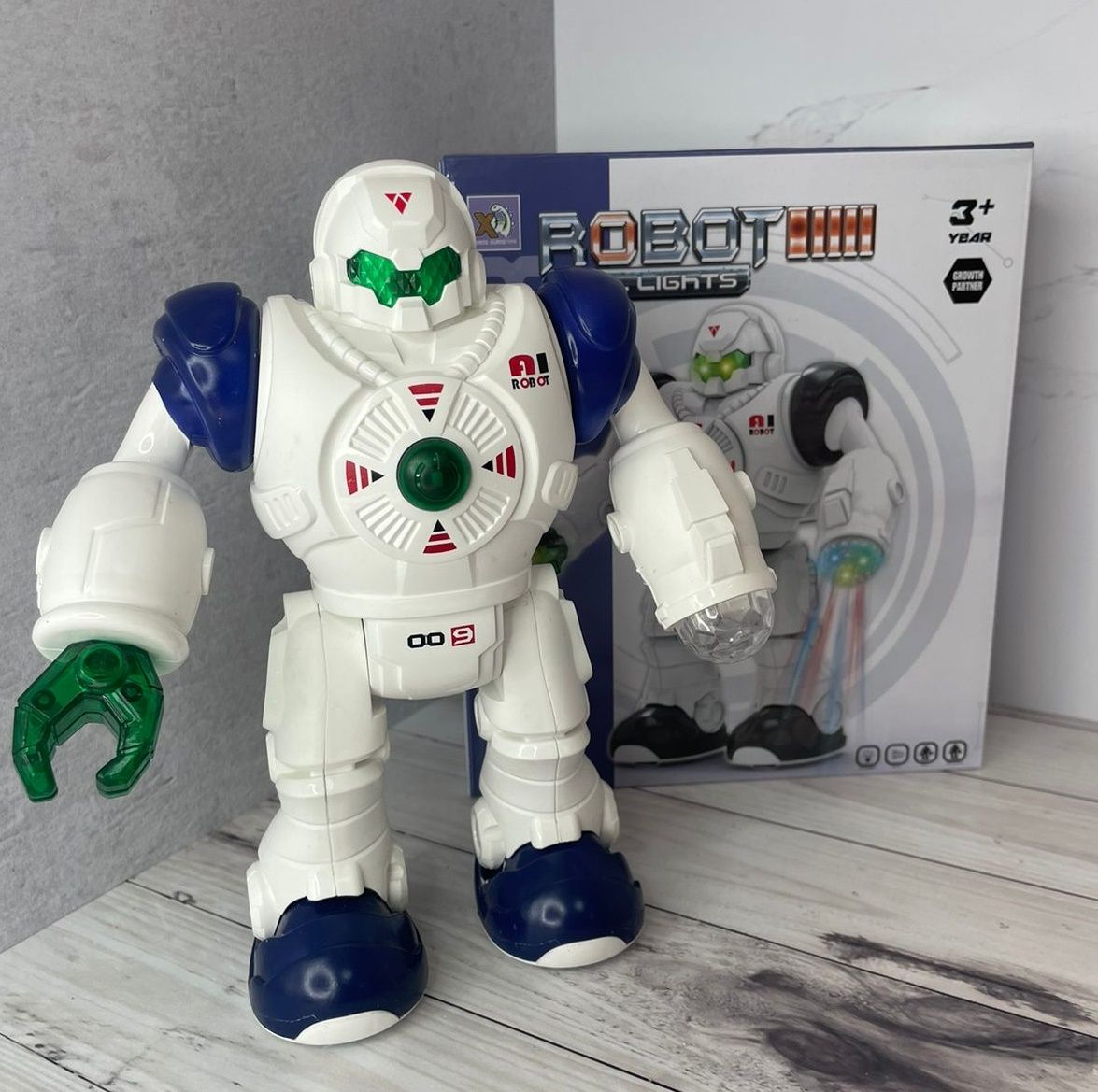 Интерактивный робот создан для настоящих поклонников высоких технологий! Многофункциональная игрушка, с которой не заскучаешь! Робот выглядит как фантастический герой-защитник.Руки и ноги робота двигаются, благодаря чему он выглядит более реалистично. При ходьбе воспроизводятся звуки стрельбы, корпус светится разноцветными огнями, а встроенный проектор проецирует перед собой цветное изображение. Игрушка полностью безопасна для детей, изготовлена из качественного пластика, имеет необходимые сертификаты. Развивает фантазию, пространственное мышление и координацию движений. Включается с помощью кнопки.. Батарейки: AA 3 шт.(не входят в комплект).
