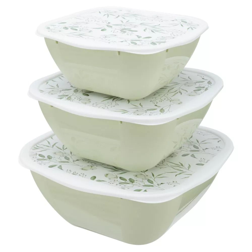 Салатники выпускаются в трех объёмах - 1,8л, 3л и 4,5л, которые удобно вкладываются друг в друга с закрытыми крышками для компактного хранения.