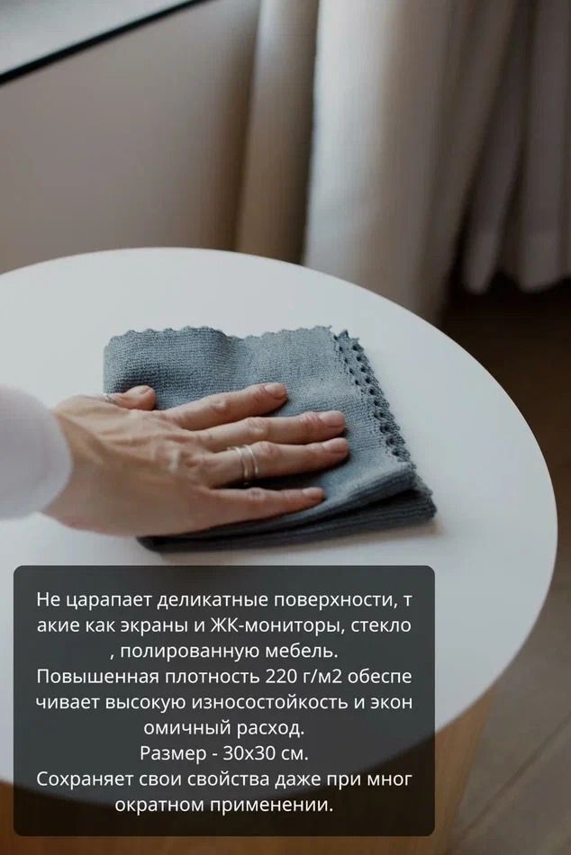 Салфетка эффективно удаляет пыль, грязь и остатки крема с обуви, а в зимнее время года — соль и другие загрязнения. Обувь лучше сохраняется. При этом салфетка легко отстирывается от гуталина. Уборка пыли: в сухом виде микроволокнистая ткань используется для очистки от пыли. При трении о поверхность возникает электростатический эффект, ткань притягивает частички пыли, а также бактерии. Поверхность приобретает пылеотталкивающие