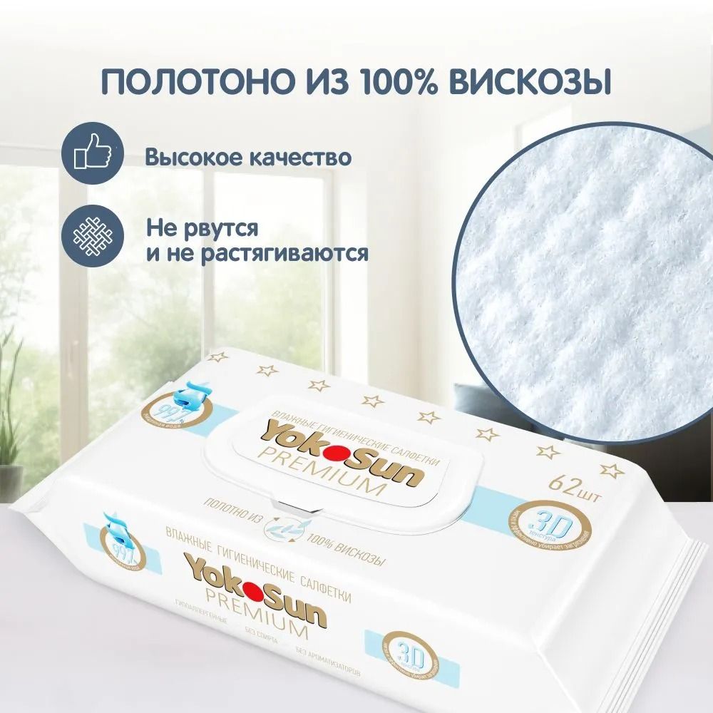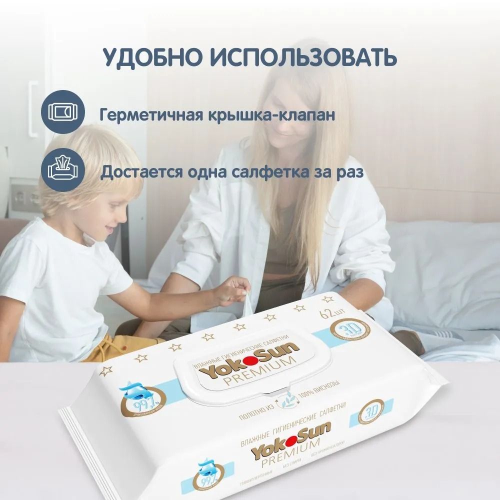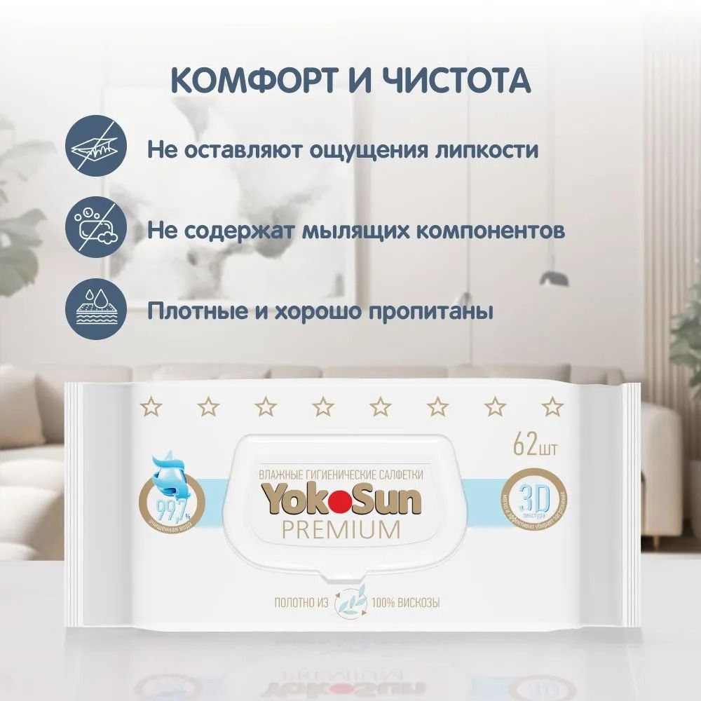 Читать все статьиСалфетки PREMIUM влажные гигиенические YokoSun 62 шт